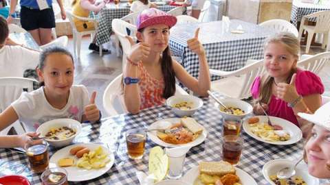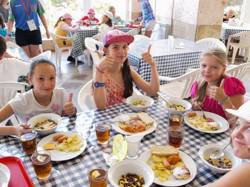 Завтрак, обед и ужин проводятся в формате «шведская линия» (в который обязательно включен витаминный стол, витаминные напитки), фруктовый полдник (сезонные фрукты и ягоды) и сонник. В июньском заезде на полдник предлагаются клубника и черешня, в июльском — яблоки, абрикосы, персики и алыча, а в августе — груши, дыни, арбузы и виноград. Перед сном дети могут подкрепиться кисломолочными продуктами (йогурт, кефир, ряженка) с выпечкой и печеньем.