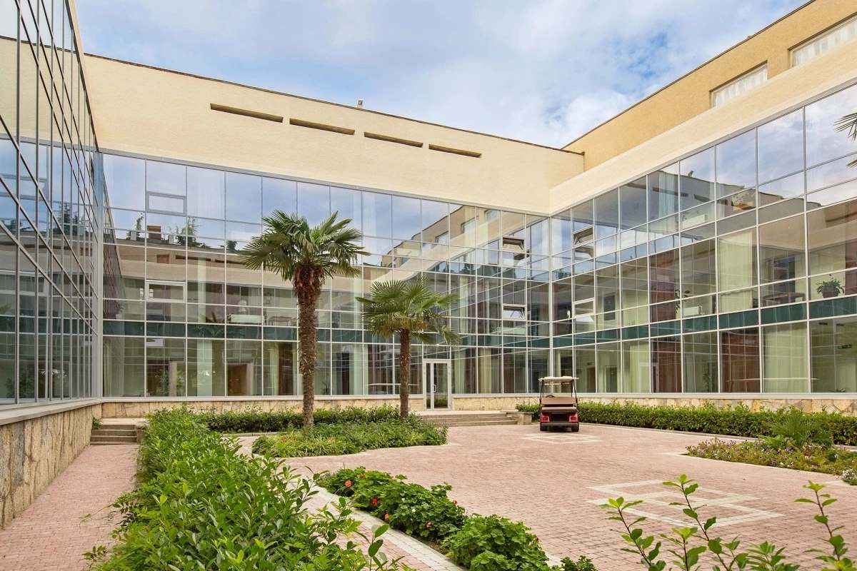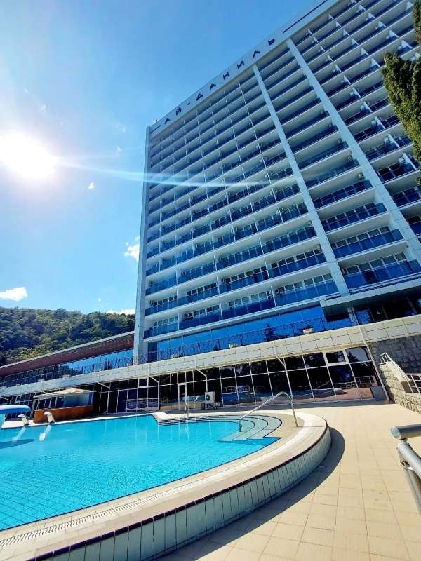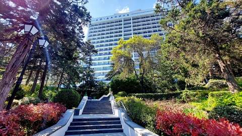 - Главный корпус — 15-этажное здание, три лифта, 150 метров до пляжа, соединен крытым переходом с лечебным корпусом.
