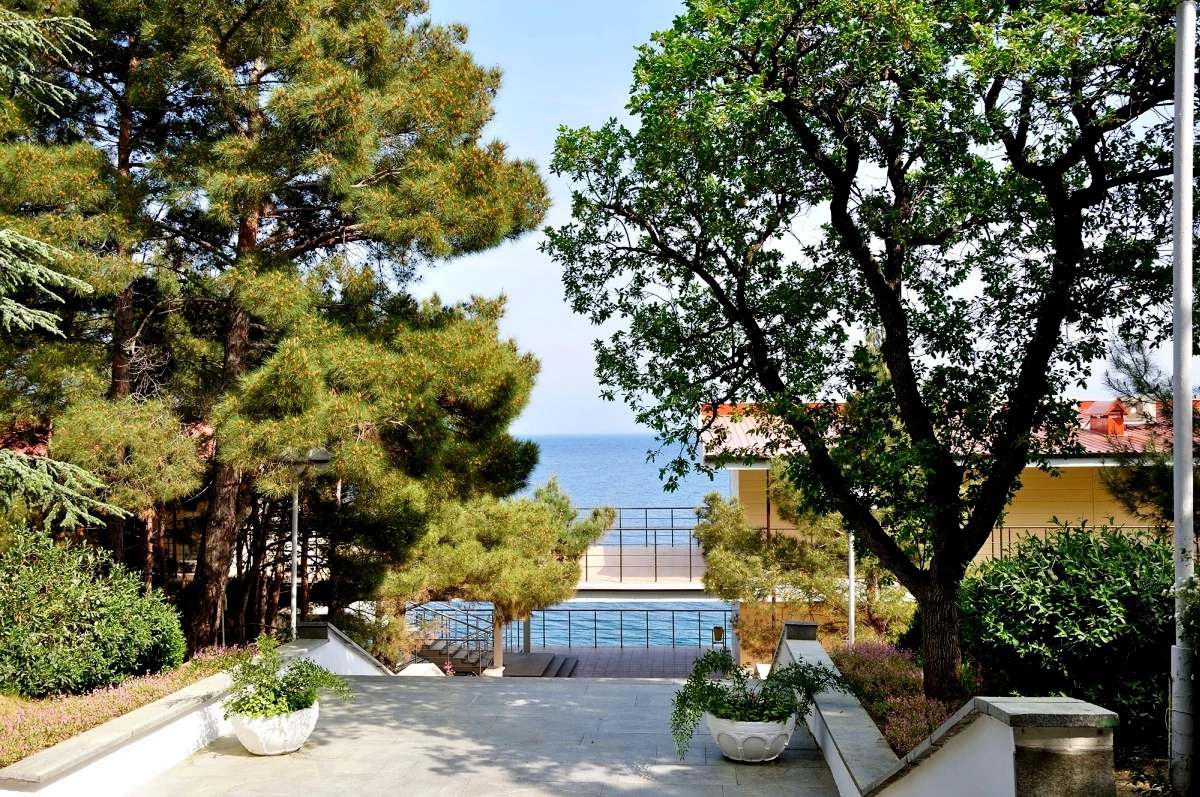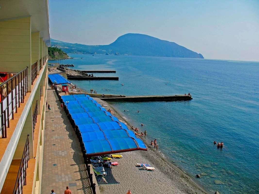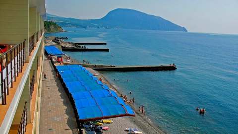 Благоустроенный мелкогалечный пляж в 150 метрах от главного корпуса, в 20 метрах от «Морского» корпуса. От главного корпуса к пляжу ведут 70 пологих ступенек. На пляже есть всё необходимое: бар, душевые, кабинки для переодевания, кафе, лежаки, навесы, площадка для пляжного волейбола, столы для настольного тенниса, туалет, шезлонги.