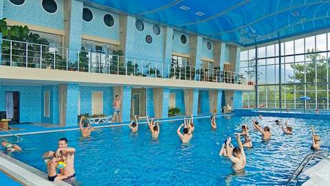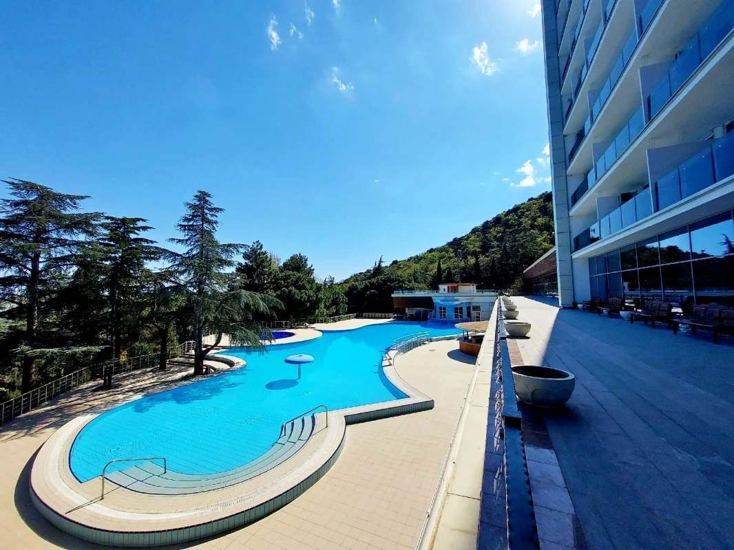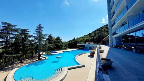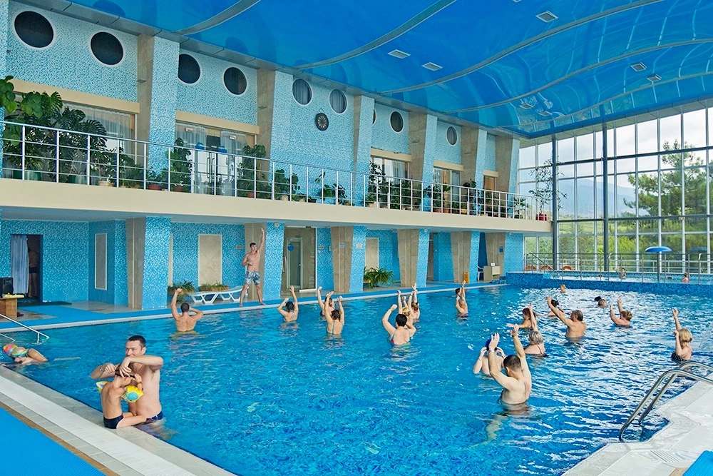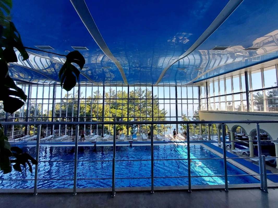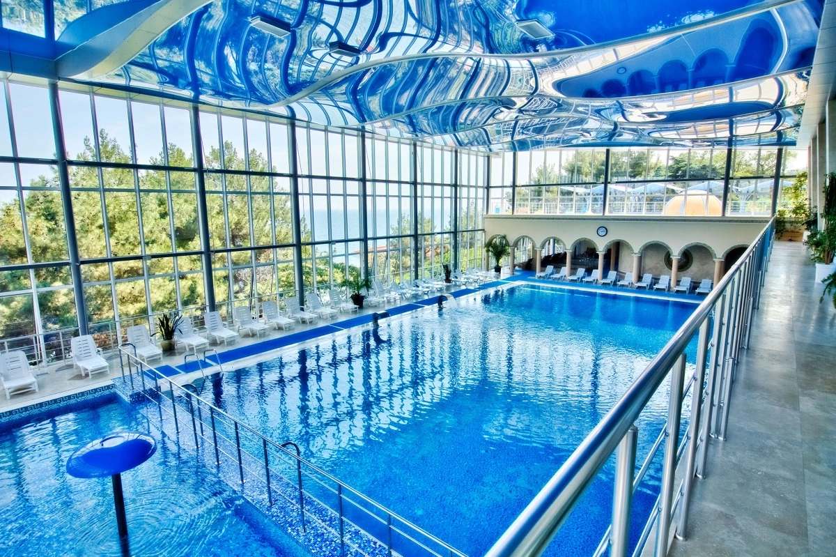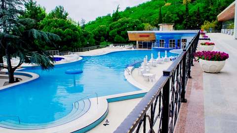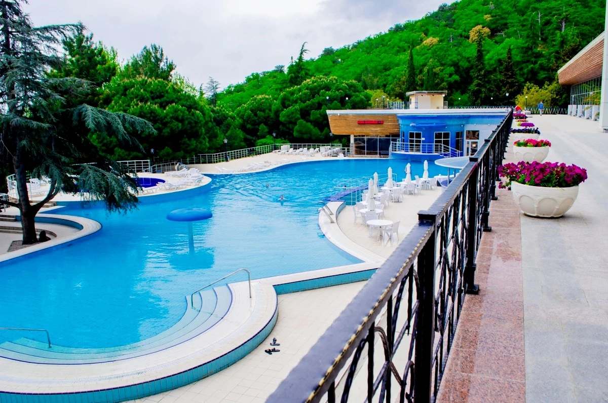На террасе перед главным корпусом санатория находится открытый бассейн с подогревом, пресной водой, водопадами и джакузи, также включающий взрослую и детскую зоны. Глубина бассейна составляет от 1,8 м с переходом к 0,6 м в детской зоне. Длина бассейна — около 50 метров, общая площадь зеркала бассейна — 650 кв. м, площадь джакузи — 46 кв. м. У бассейна — зона отдыха с шезлонгами и летняя площадка бара.