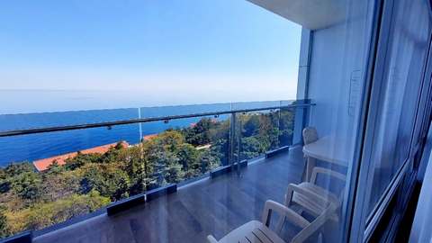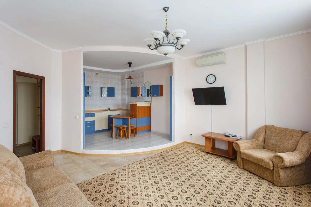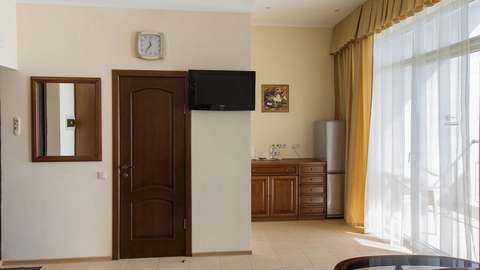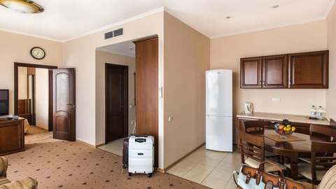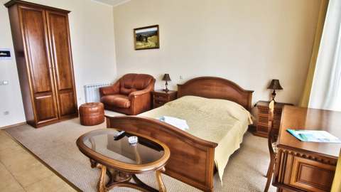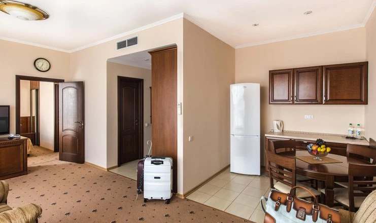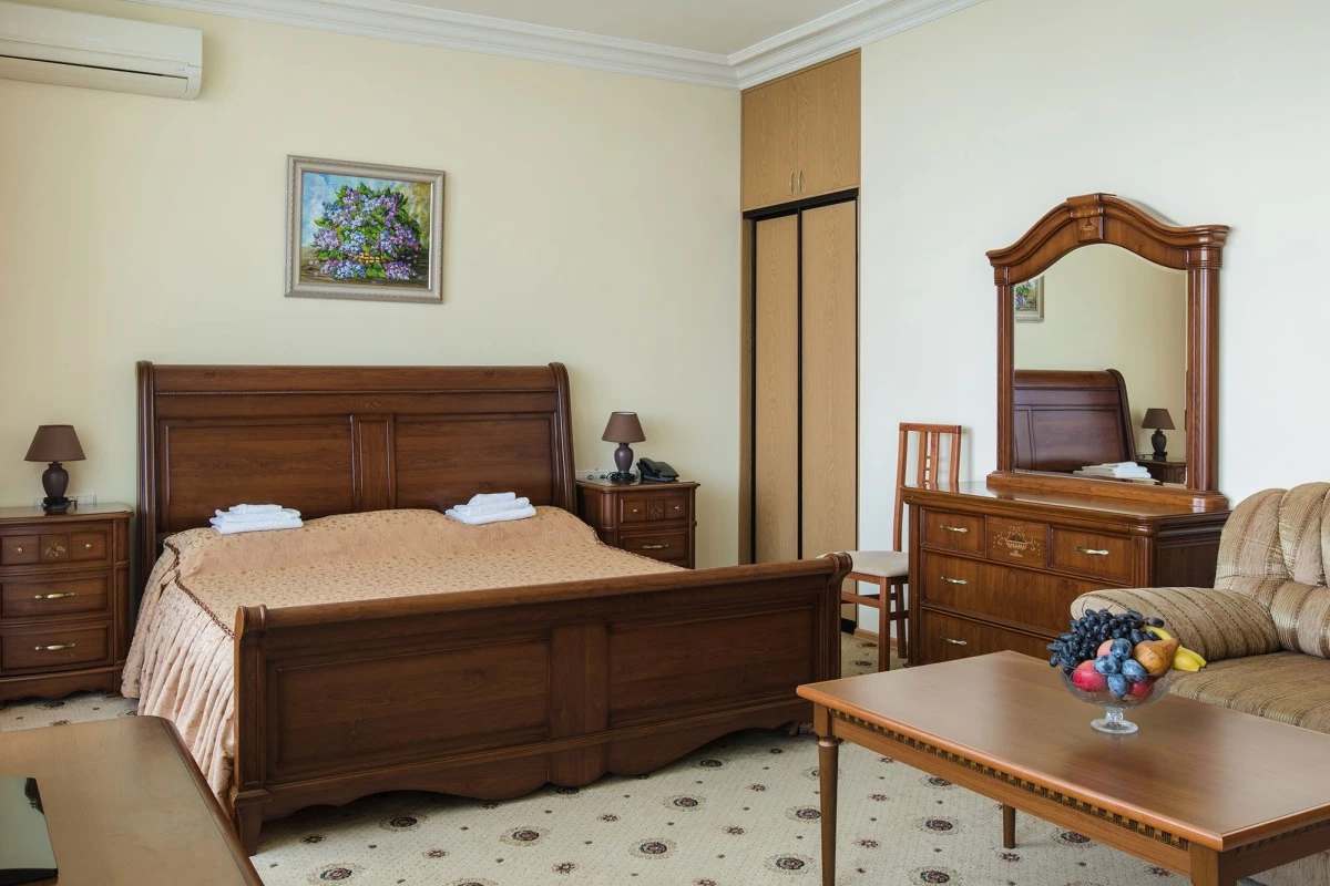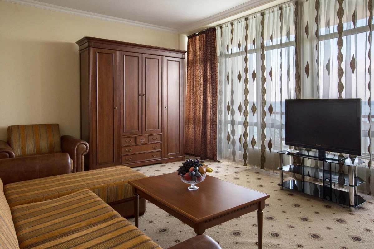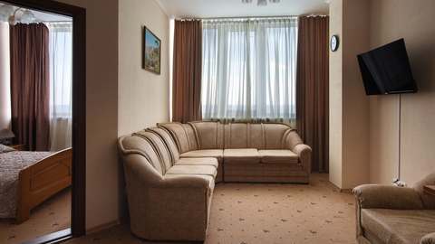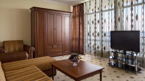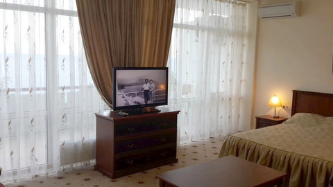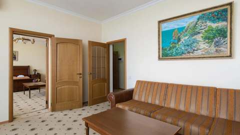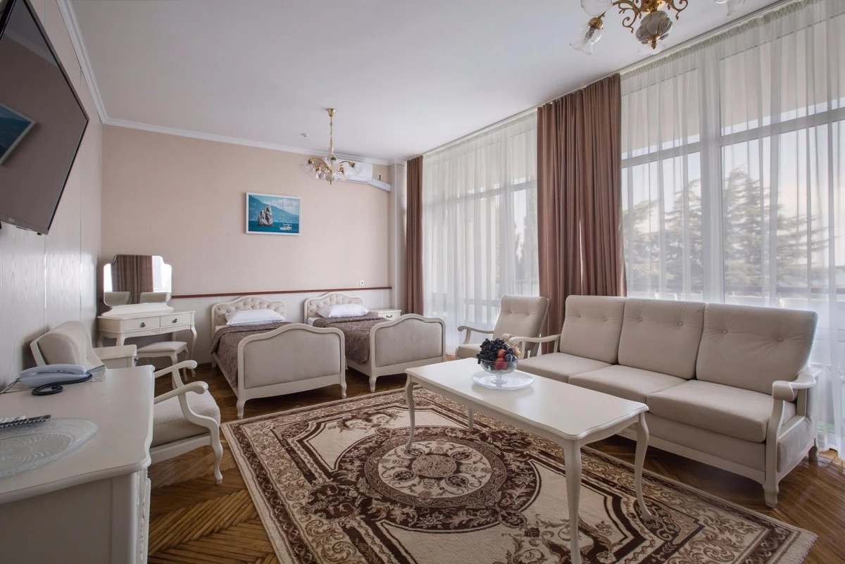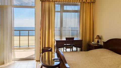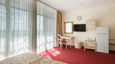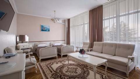 Площадь номера: 45 кв. м. В номере: в спальне — двуспальная кровать; в гостиной — диван и кресло, набор мебели, кондиционер, телефон, чайник, набор посуды, телевизор, холодильник, фен, сейф, халат и тапочки; Wi-Fi; два санузла с душевой кабиной; балкон с видом на побережье и парк санатория. Дополнительные места: два (раскладной диван).