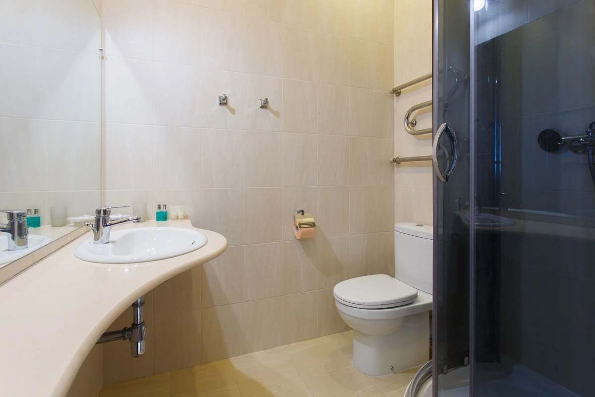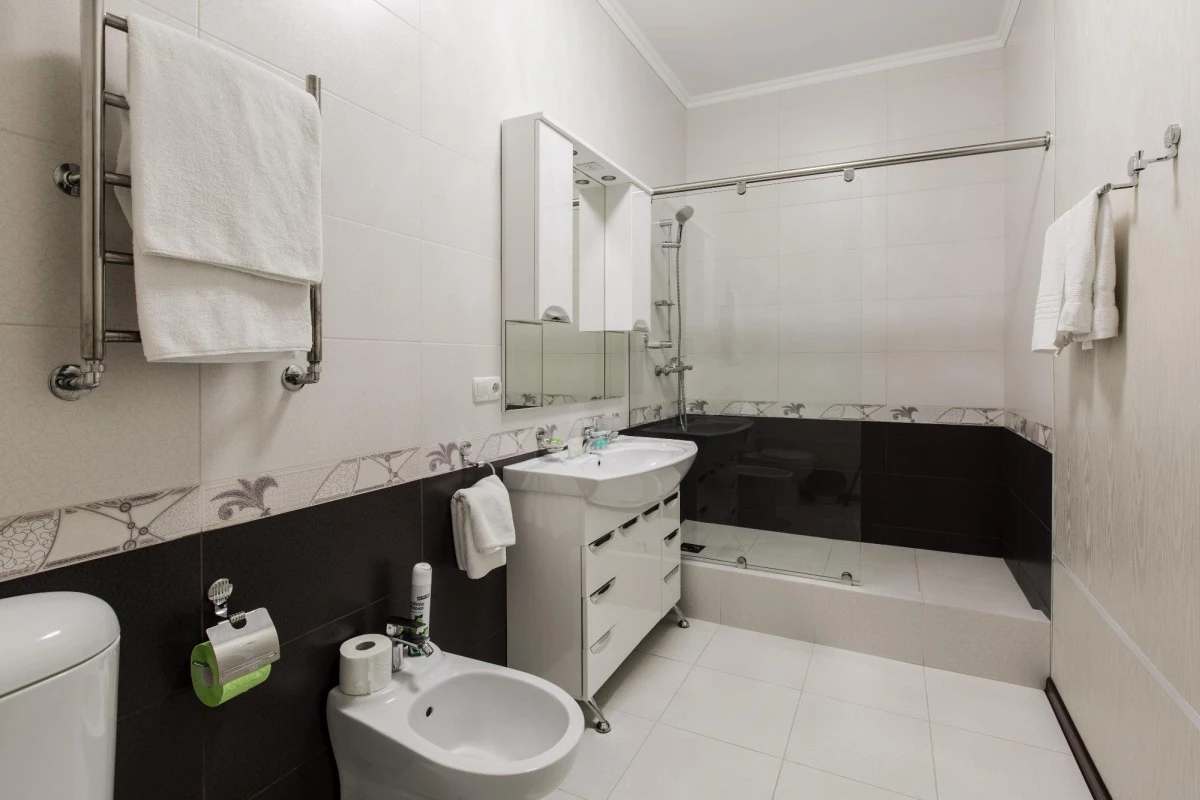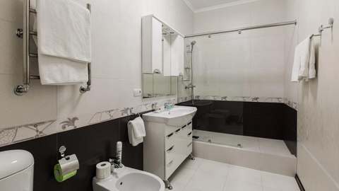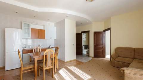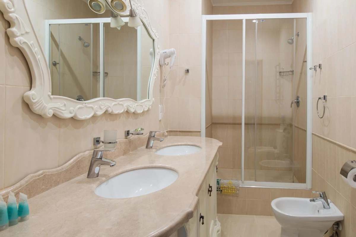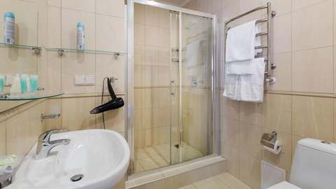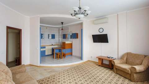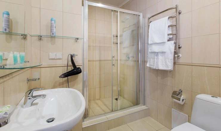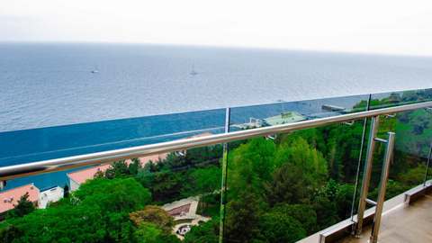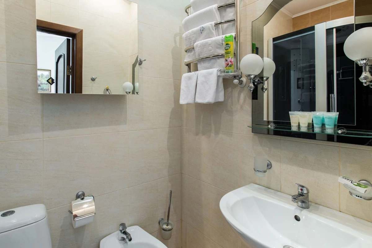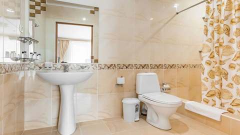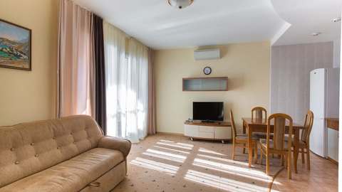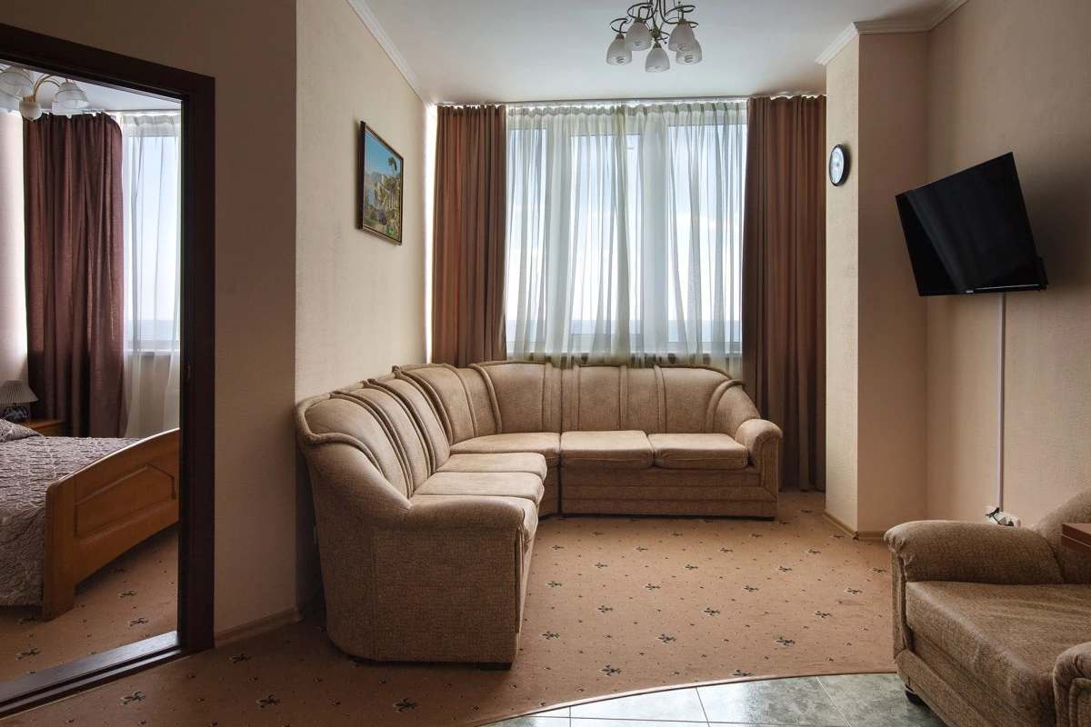 Площадь номера: 45 кв. м. В номере: в спальне — двуспальная кровать; в гостиной — диван и кресло, набор мебели, кондиционер, телефон, чайник, набор посуды, телевизор, холодильник, фен, сейф, халат и тапочки; Wi-Fi; два санузла с душевой кабиной; балкон с видом на побережье и парк санатория. Дополнительные места: два (раскладной диван).