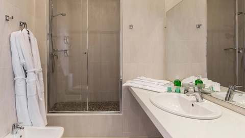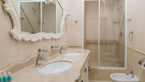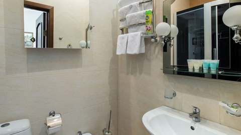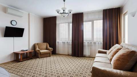 Площадь номера: 42 кв. м. В номере: в спальне — двуспальная кровать, в гостиной — диван и кресло, кондиционер, телефон, чайник, набор посуды, телевизор, душ, туалет, холодильник, фен, сейф, халат и тапочки; Wi-Fi; просторная ванная комната с душевой кабиной. Номер без балкона. Дополнительные места: два (раскладной диван).