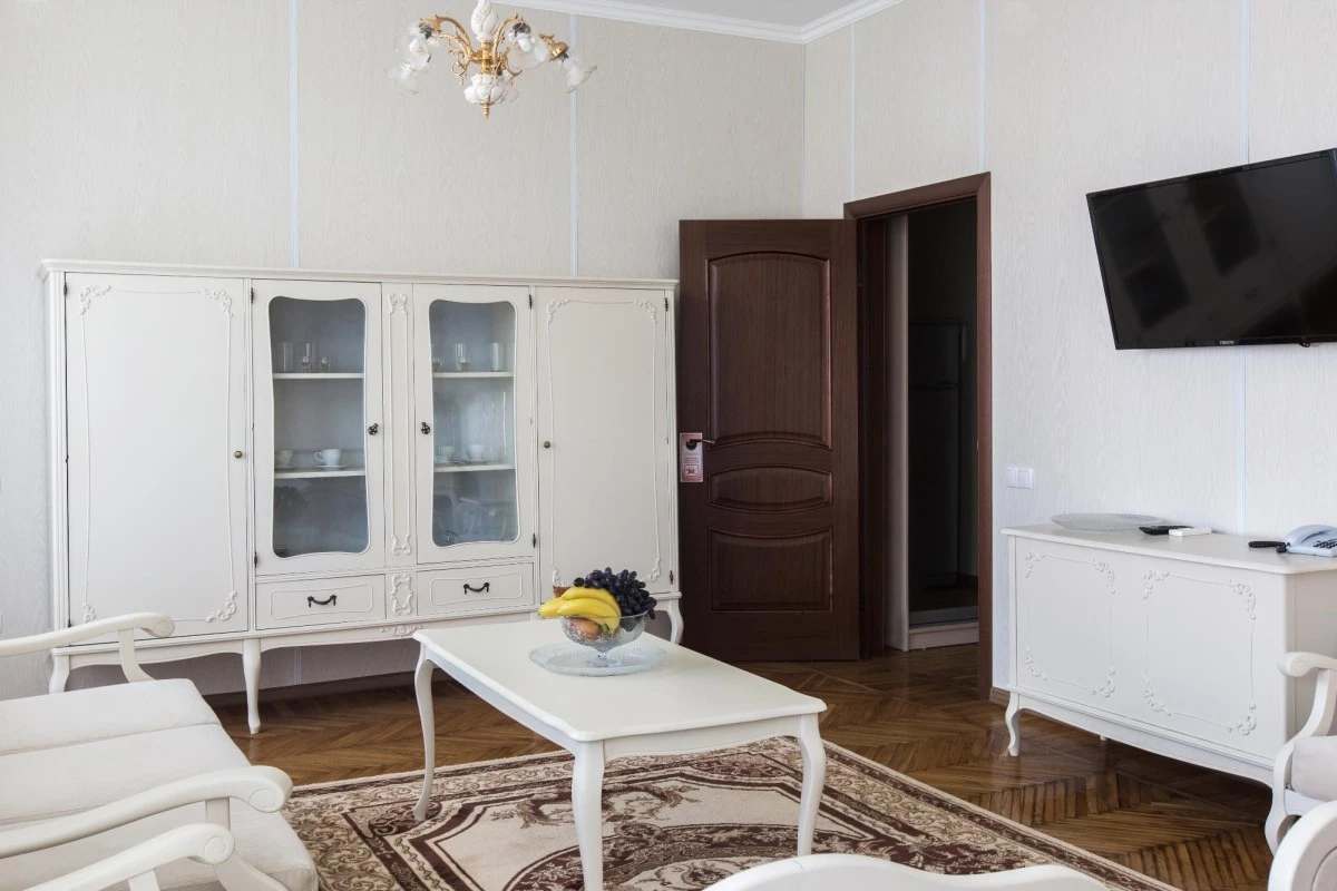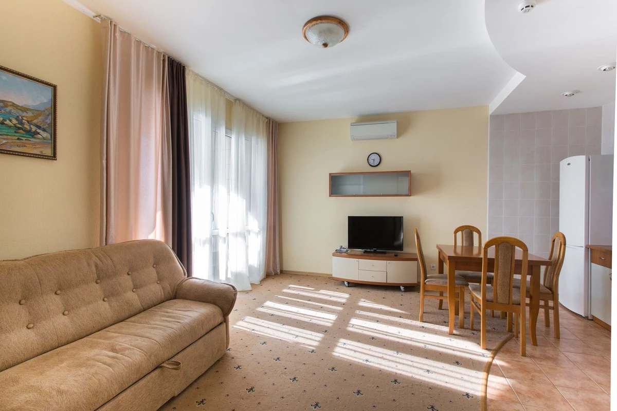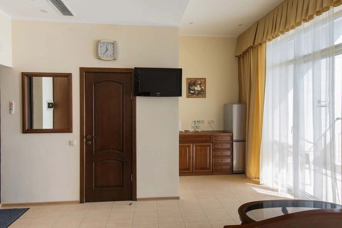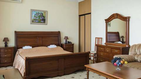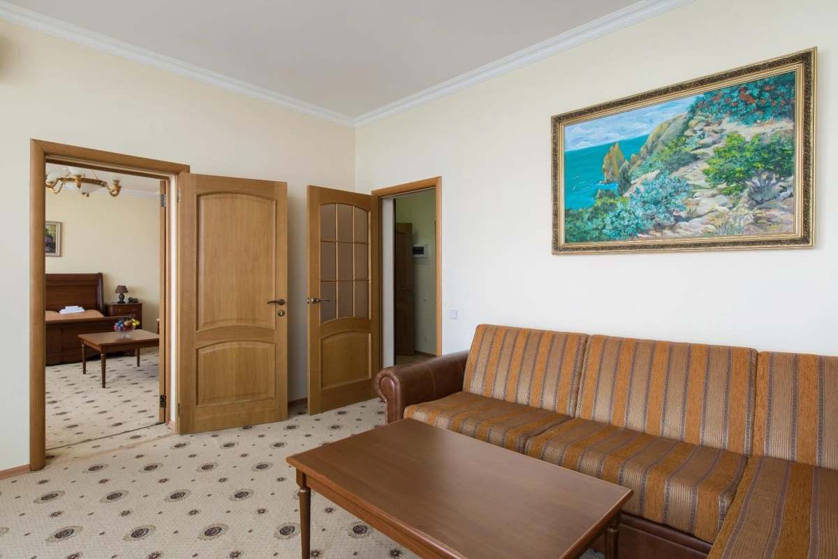 Площадь номера: 72 кв. м. В номере: двуспальная кровать, диван и кресла, Wi-Fi, кондиционер, сейф, телефон, чайник, телевизор, душ, туалет, холодильник, фен, посуда, утюг. Номер состоит из двух комнат, соединенных межкомнатной дверью и имеющих отдельные входы. Открытый балкон с видом на море, бассейн и реликтовый парк. Дополнительные места: два (диван).