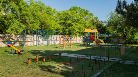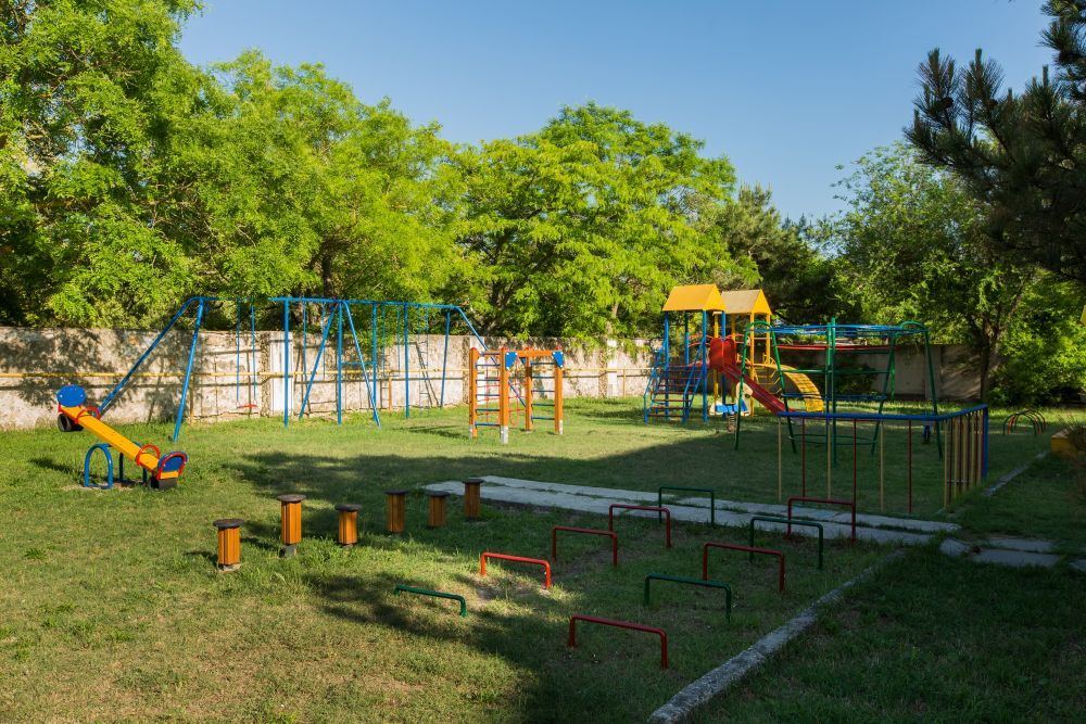 Для детей: детская игровая площадка, детские коляски, кроватки, стульчики в зале столовой.