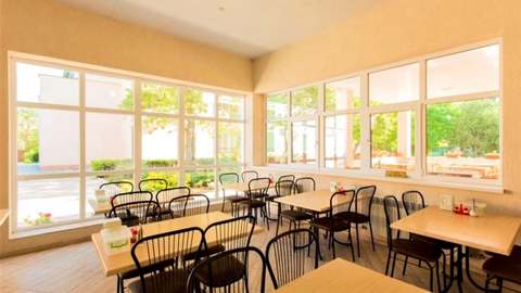 Тарифы на выбор: проживание без питания, проживание с завтраком или с 3-разовым питание. Тип питания — комплексное меню. Здание столовой в 20 метрах от корпуса, обслуживание официантами.