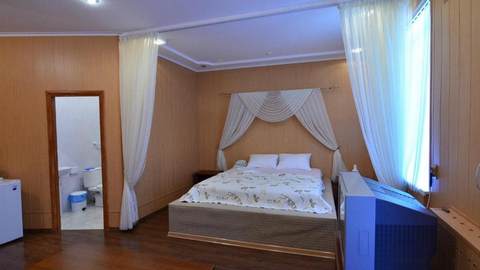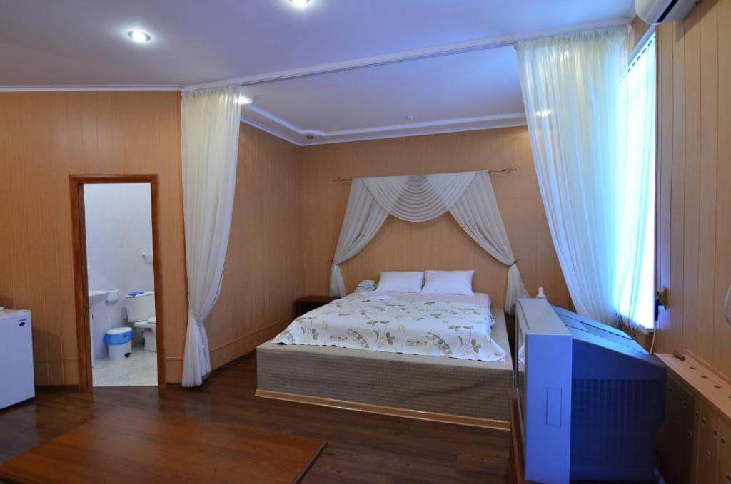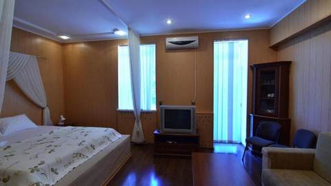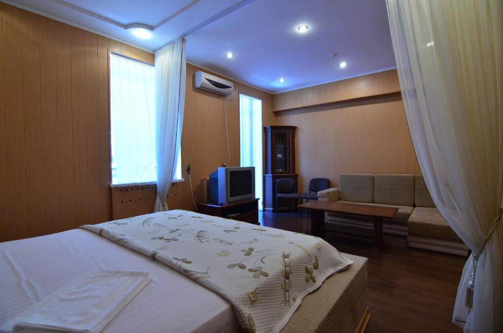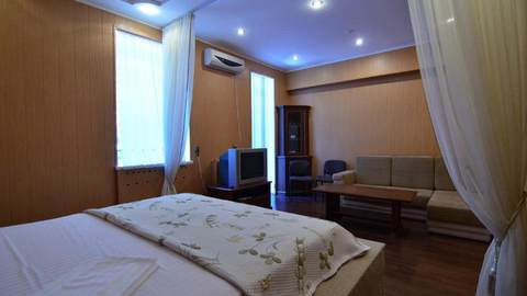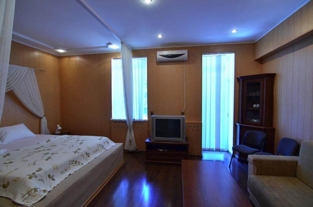В номере: двуспальная кровать, диван, телевизор, холодильник, набор мебели, шкаф, прикроватные тумбочки, зеркало, кондиционер, журнальный столик, Wi-Fi, санузел с ванной, фен, чайник. Номер с балконом. Дополнительное место в номере — еврораскладушка.