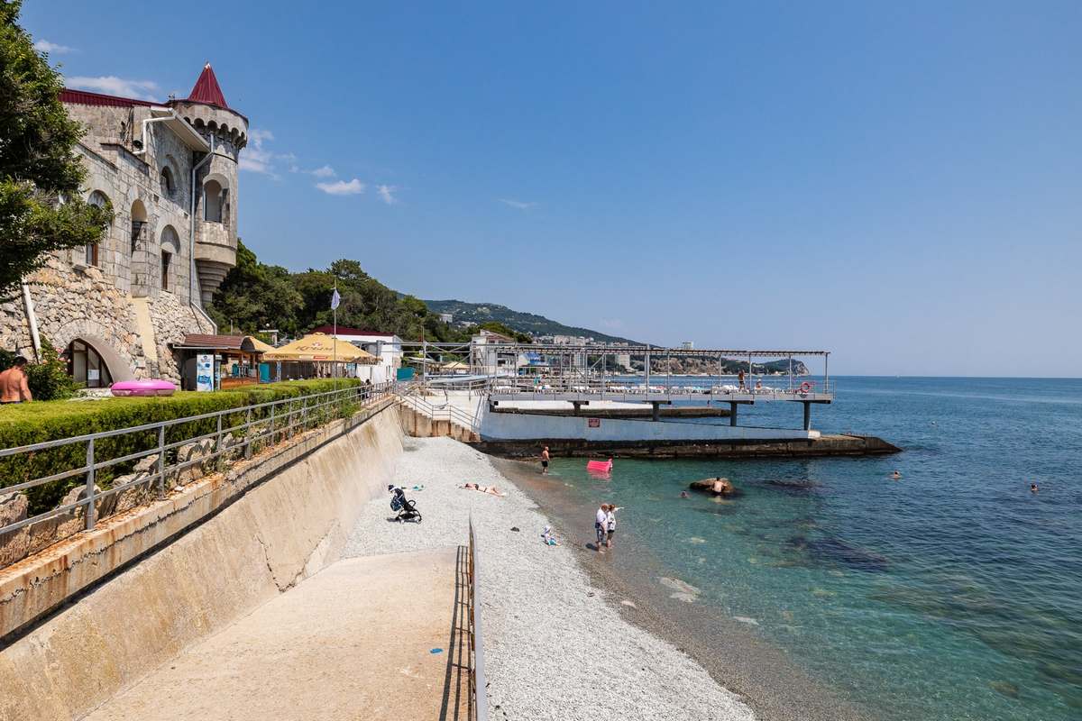 Собственный мелкогалечный оборудованный пляж. Пляж имеет статус лечебного: закрыт для посторонних, вход на пляж строго по санаторным книжкам. Расстояние от территории санатория до пляжа — 500 метров. Бесплатный трансфер от пляжа и обратно. Пляж оборудован теневыми навесами, шезлонгами, медпунктом, спасательной службой, летним кафе-баром на открытом воздухе.