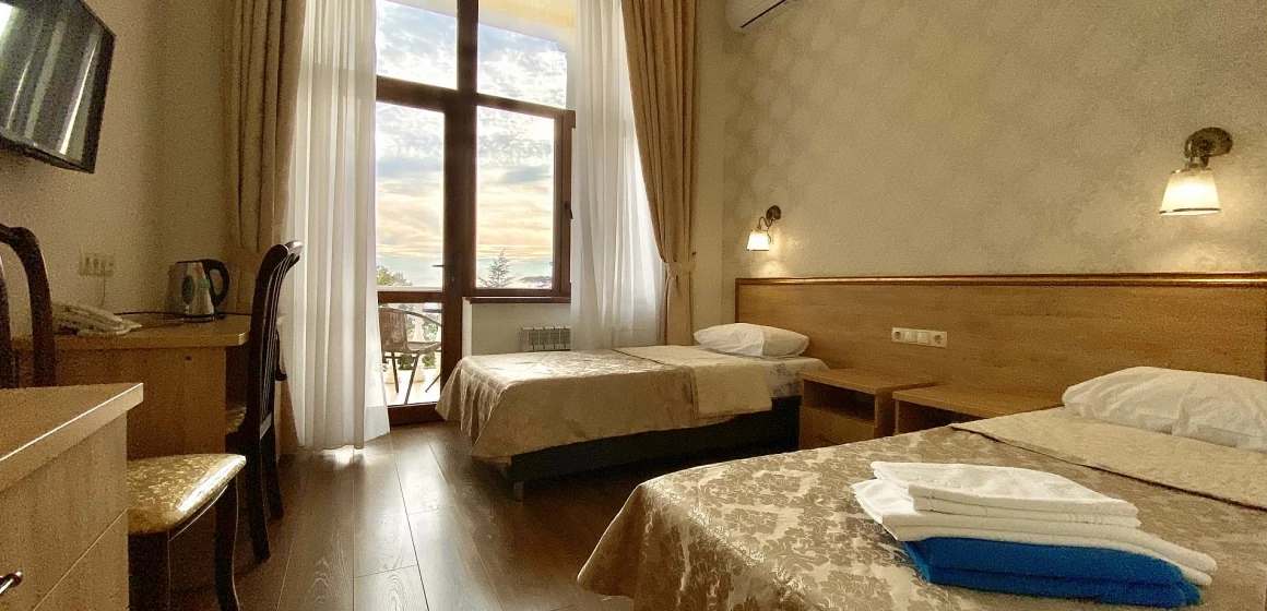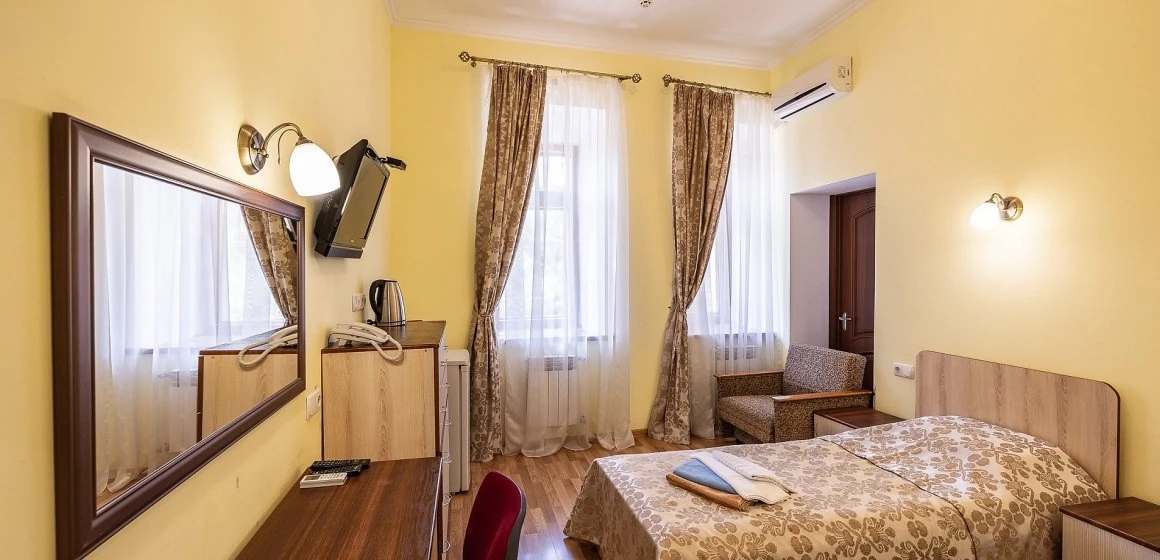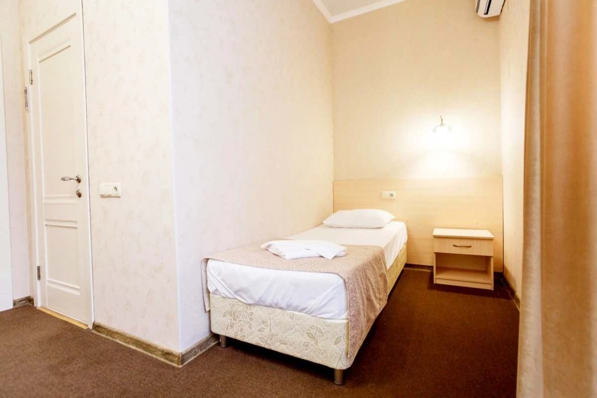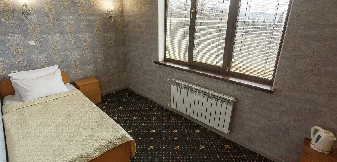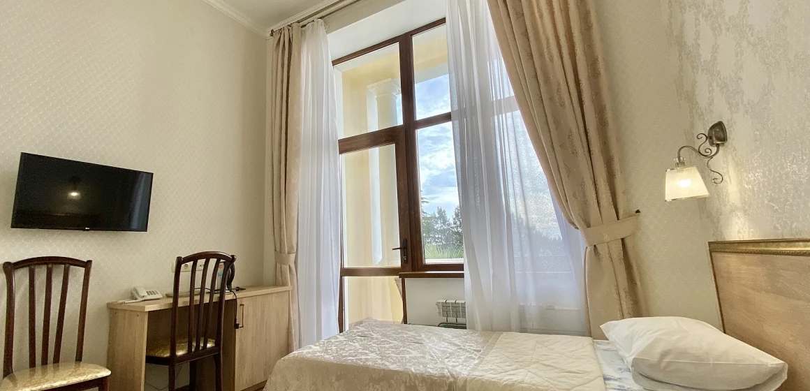 Площадь номера — 11 кв. м. В номере: одна односпальная кровать, мебель (тумбочка, шкаф, стол, стул), кондиционер, холодильник, телевизор, Wi-Fi в номере, ванная комната с душем, фен, набор банных принадлежностей. Номер без балкона с видом на Ай-Петри.