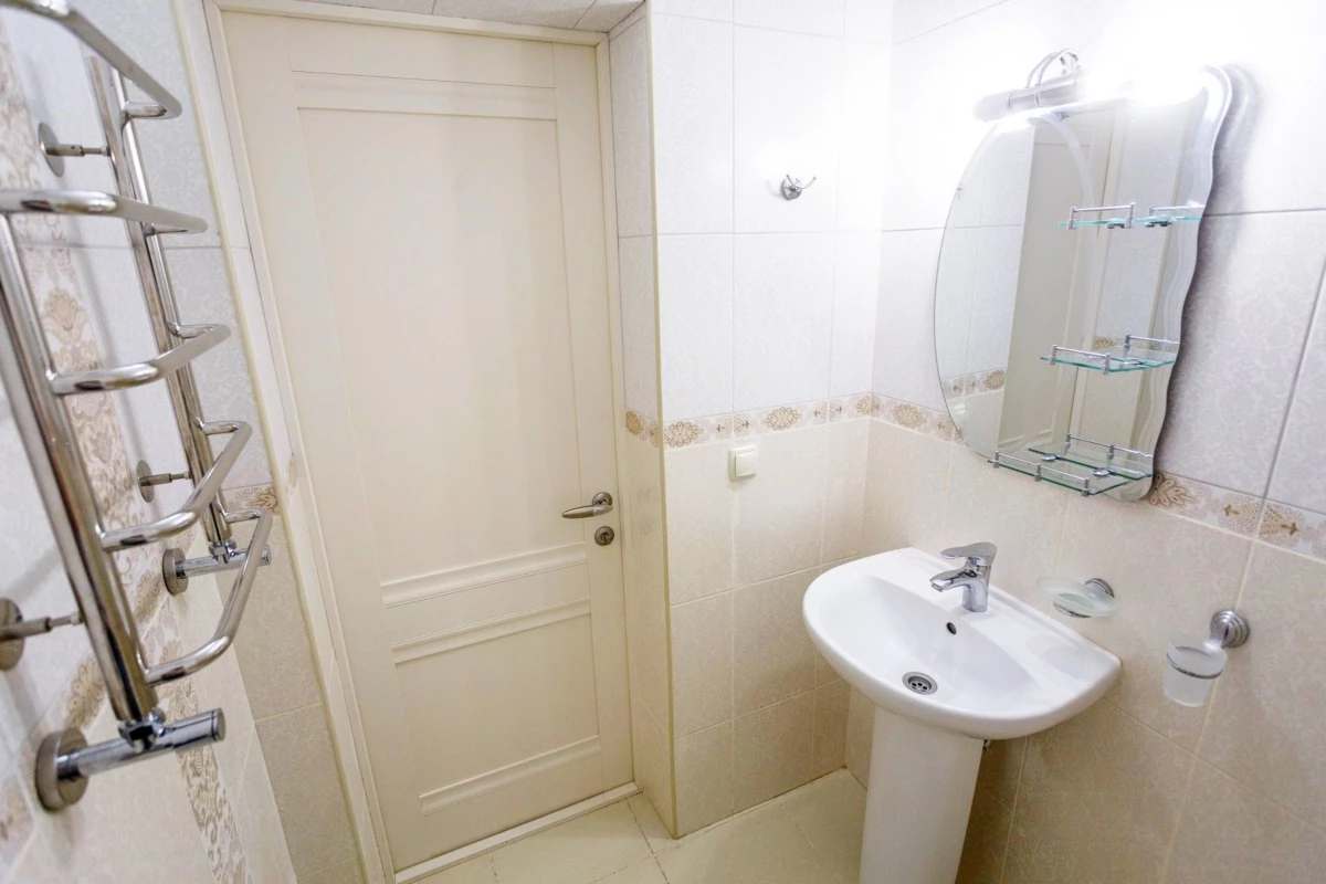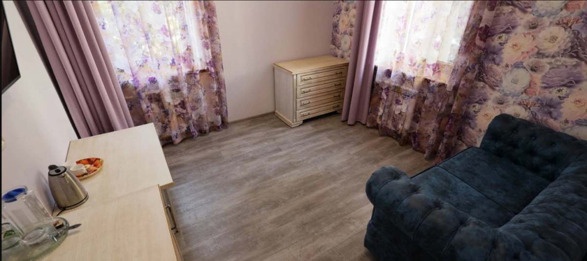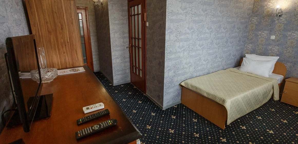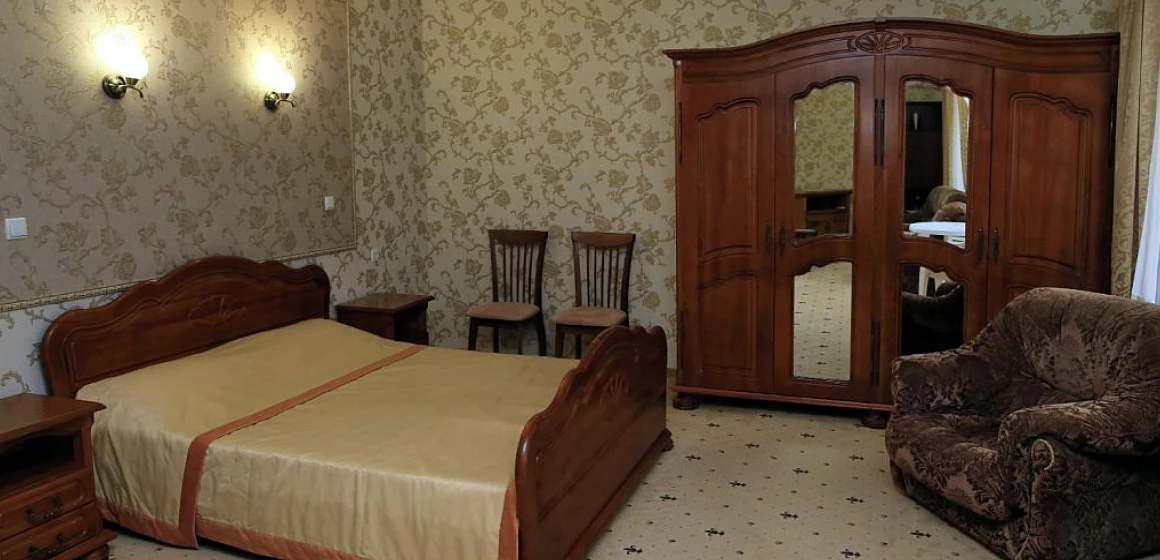 Площадь номера — 29 кв. м. В номере: одна двуспальная кровать, диван, мебели (тумбочка, шкаф, столик), санузел с душем, полотенцесушитель, телевизор, холодильник, кондиционер. Номера без балкона, вид на парк санатория.