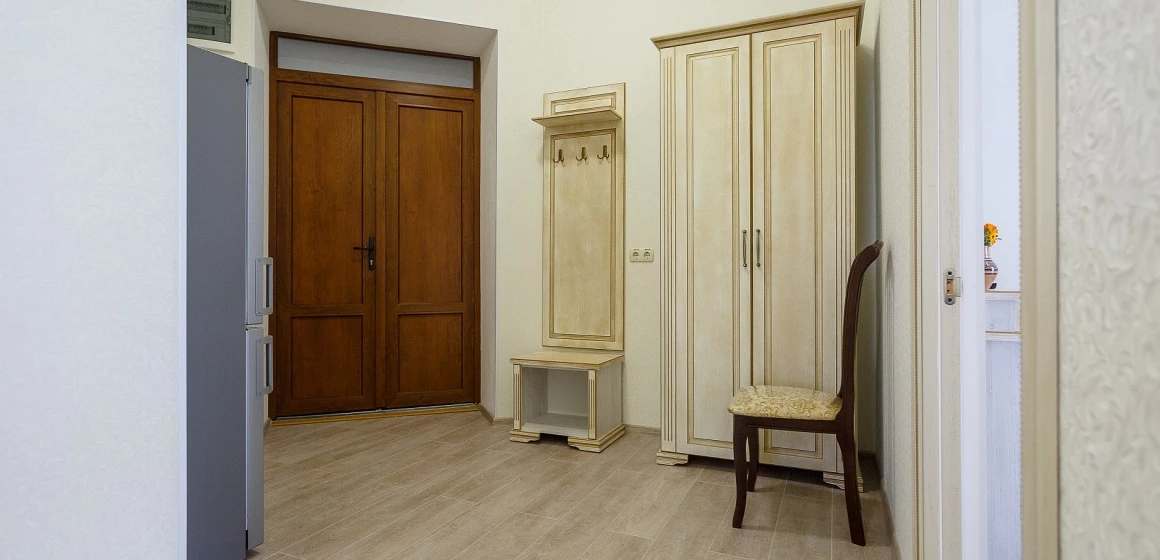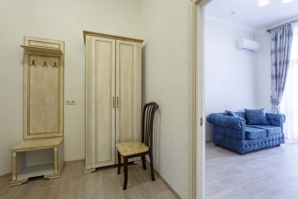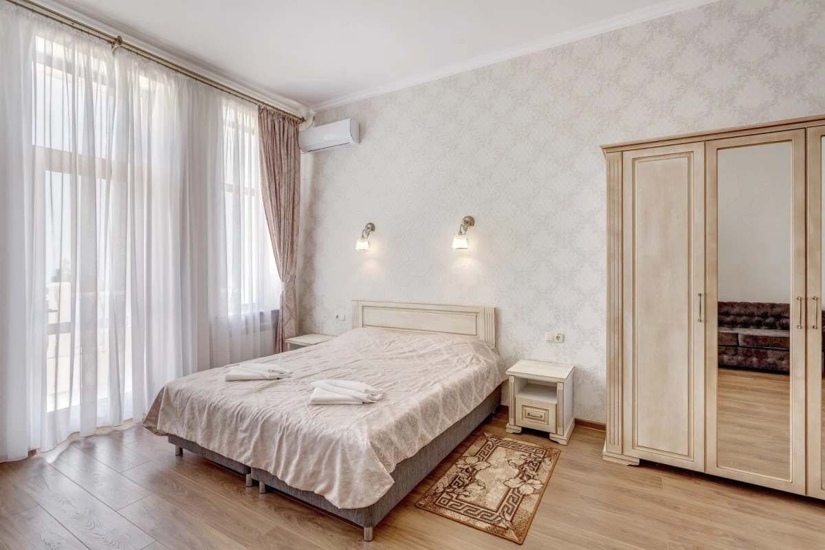 Площадь номера — 40–52 кв. м. В номере: двуспальная кровать, гостиная, прихожая, мягкая мебель (раскладные диваны, кресла), кондиционер, холодильник, телевизор, Wi-Fi в номере, кухня с электроплитой, стиральная машина, электрочайник, столовая и чайная посуда, гладильная доска, утюг, ванная комната с душем или ванной, фен, набор банных принадлежностей. Номер с балконом с видом на море.