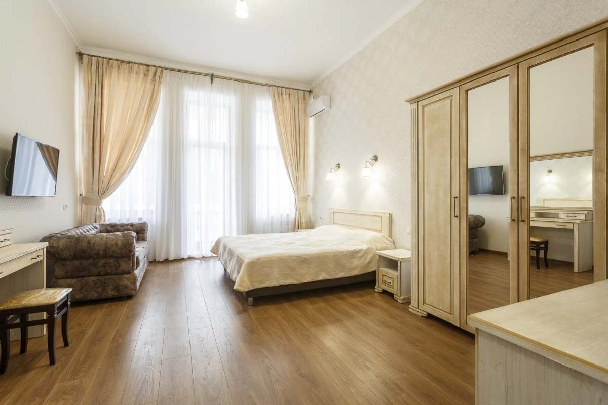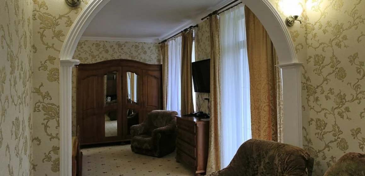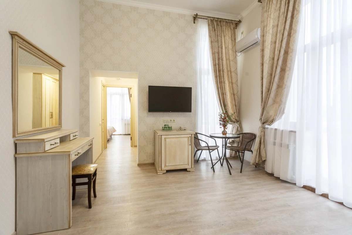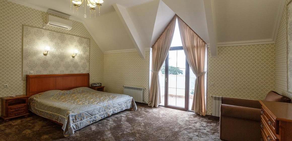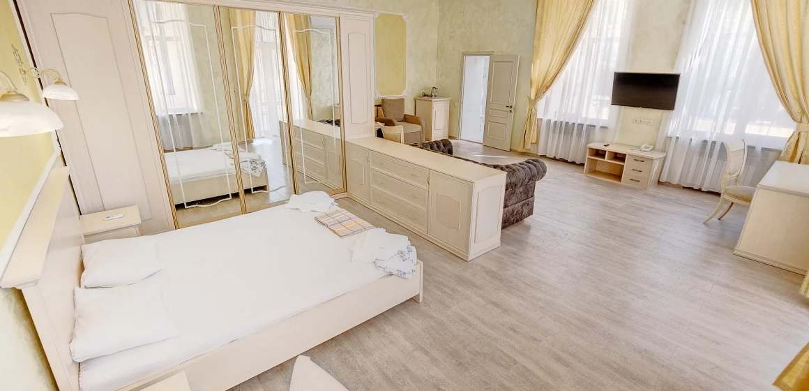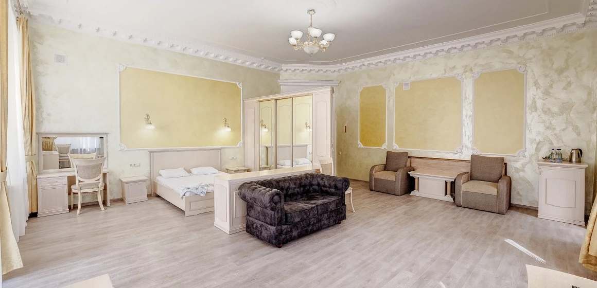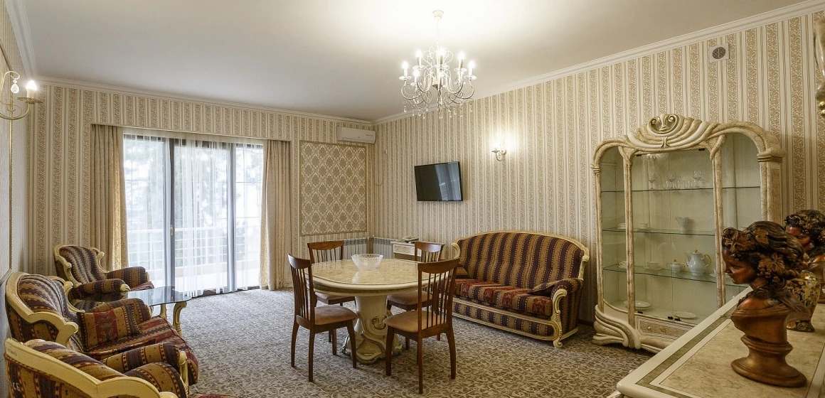 Площадь номера — 75 кв. м. Просторные трехкомнатные номера категории «Люкс» с прекрасной спальней, просторной прихожей, уютной гостиной и столовой. В номере: две двуспальных кровати, мягкая мебель, кондиционер, холодильник, телевизор, Wi-Fi в номере, электрочайник, набор посуды, гладильная доска, утюг, ванная комната с душем или ванной, фен, набор банных принадлежностей. Номера с балконом с восхитительным видом на морской пейзаж, гору Ай-Петри, старинный парк санатория и розарий.
