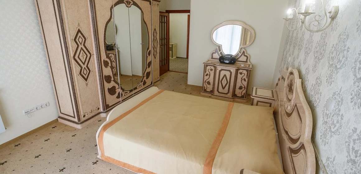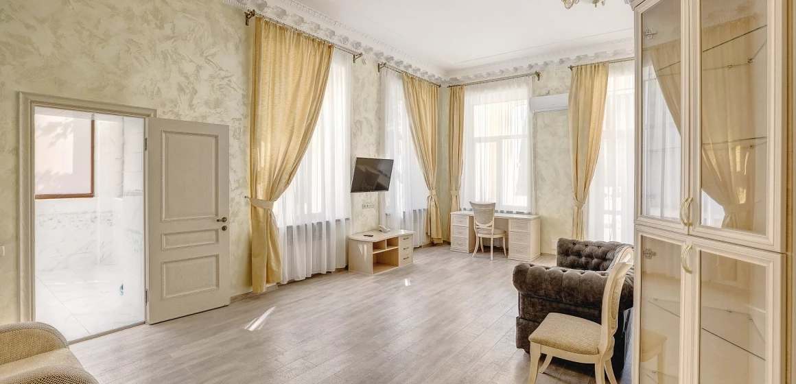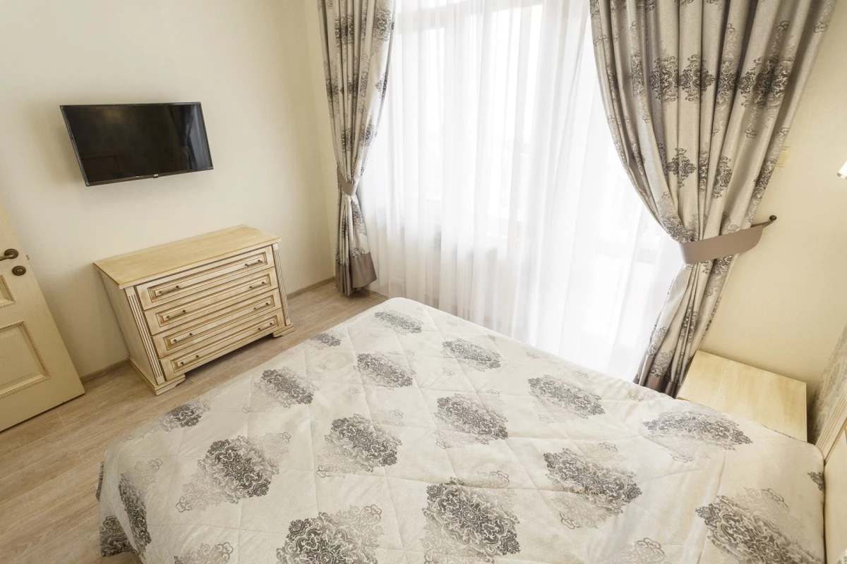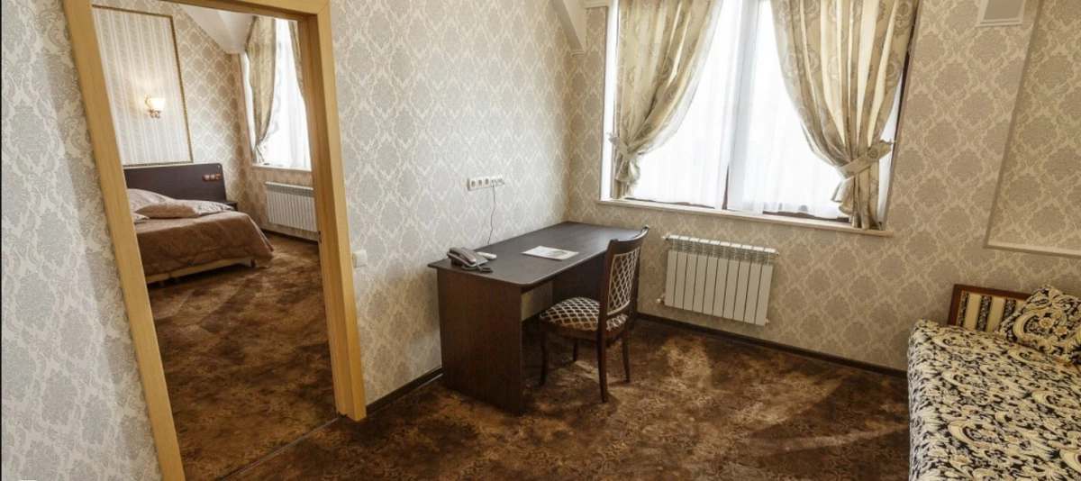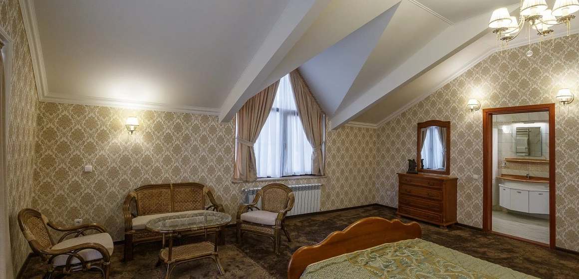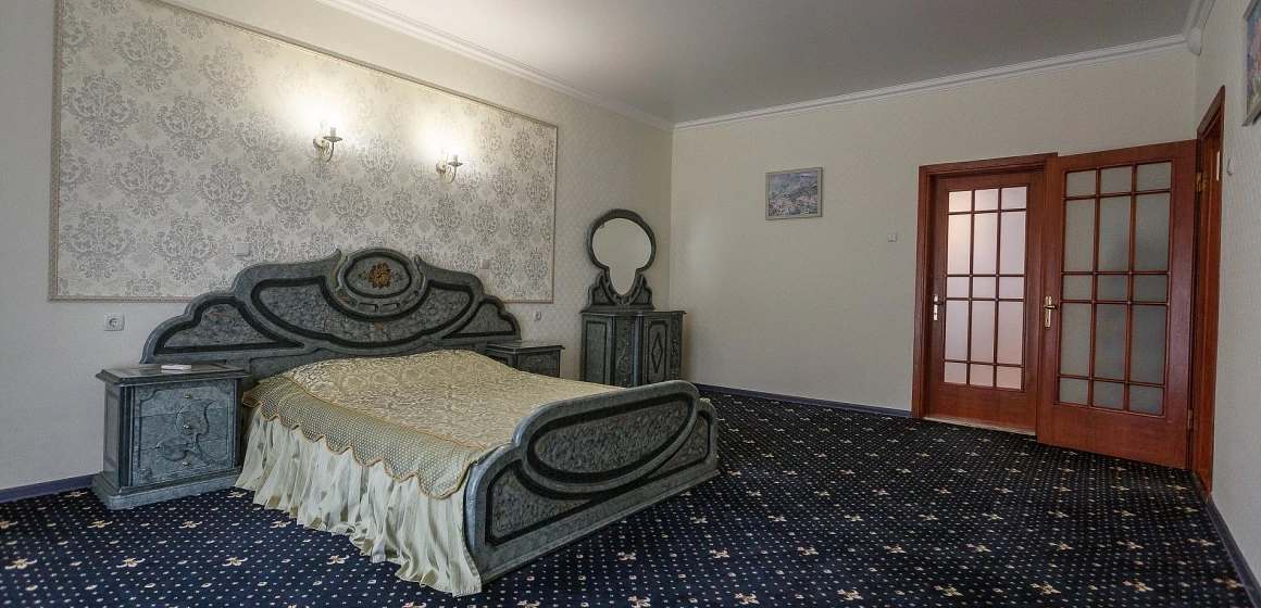 Площадь номера — 75 кв. м. Просторные трехкомнатные номера категории «Люкс» с прекрасной спальней, просторной прихожей, уютной гостиной и столовой. В номере: две двуспальных кровати, мягкая мебель, кондиционер, холодильник, телевизор, Wi-Fi в номере, электрочайник, набор посуды, гладильная доска, утюг, ванная комната с душем или ванной, фен, набор банных принадлежностей. Номера с балконом с восхитительным видом на морской пейзаж, гору Ай-Петри, старинный парк санатория и розарий.