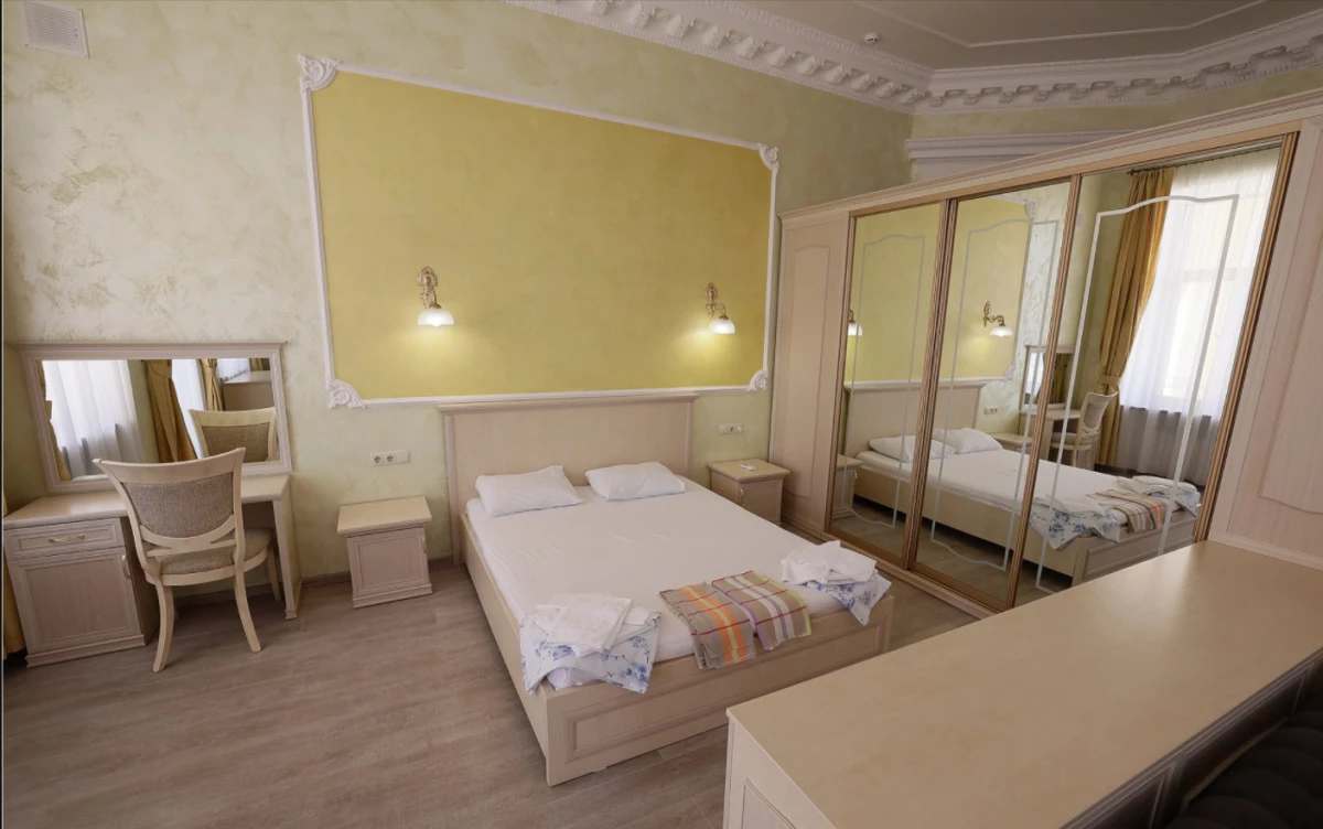 Площадь номера — 27–39 кв. м. В номере: одна двуспальная или две односпальные кровати, набор мебели (диван, кресло, бра и пр.); санузел с душевой кабиной; кабельное телевидение; холодильник; кондиционер. Номер с балконом, вид на море или на парк санатория.