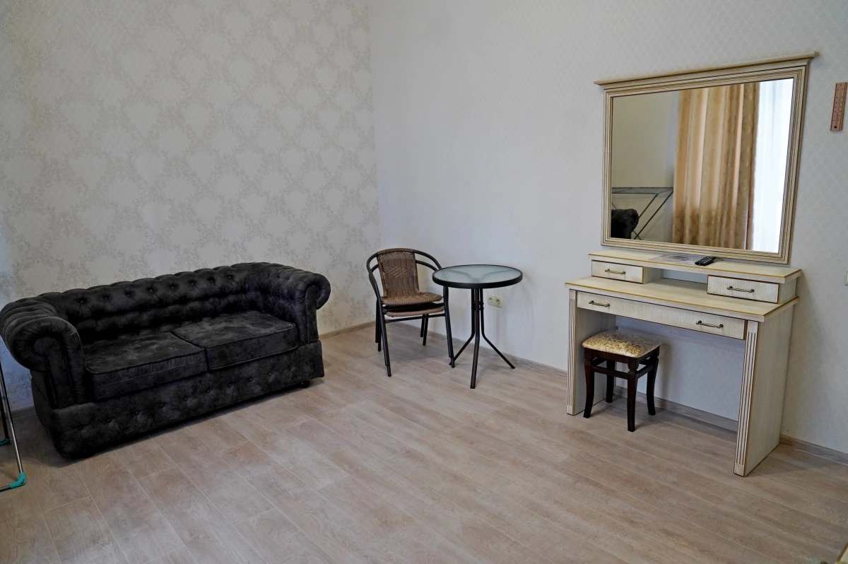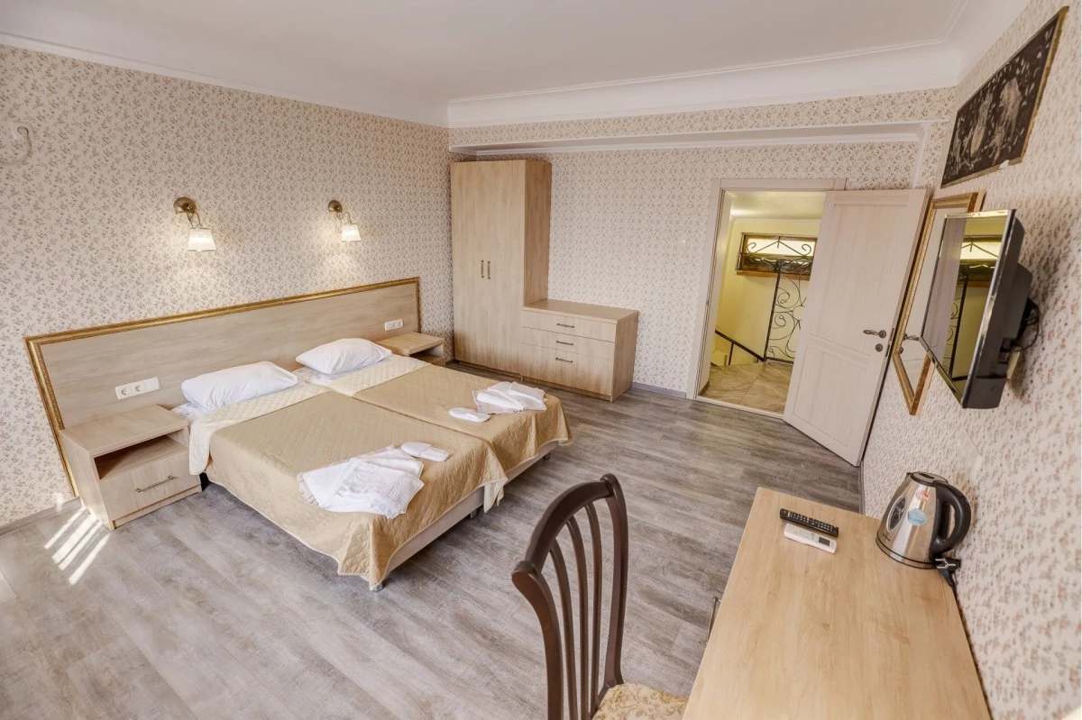 Площадь номера — 47 кв. м. В номере: одна двуспальная или две односпальные кровати, диван, набор мебели (тумбочка, шкаф, стол, стул), санузел, душ, полотенцесушитель, телевизор, холодильник, кондиционер. Номера без балкона с видом на море.