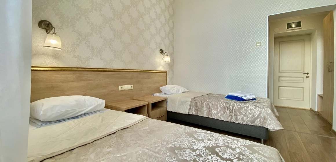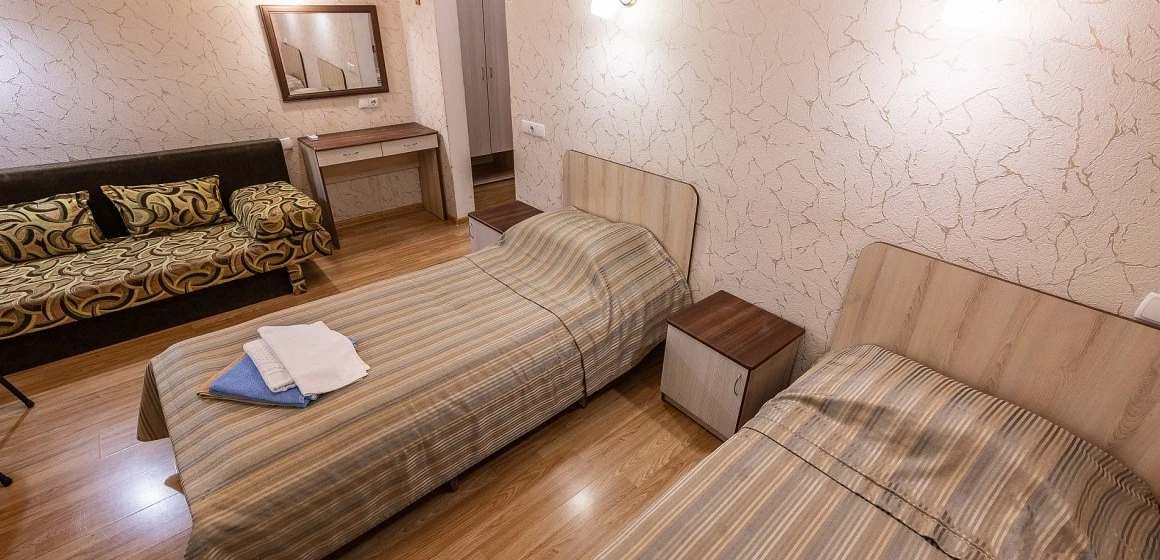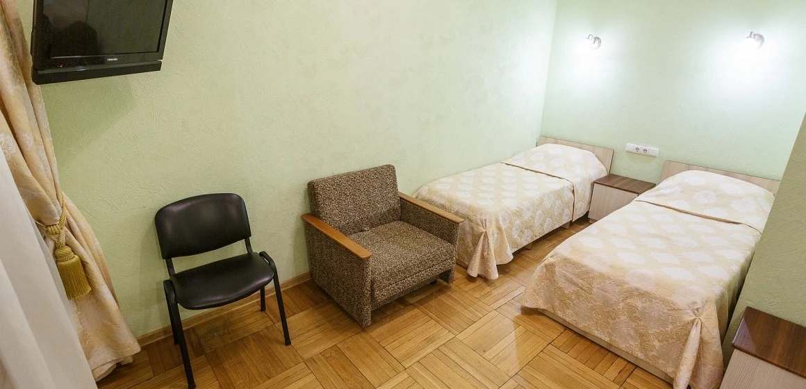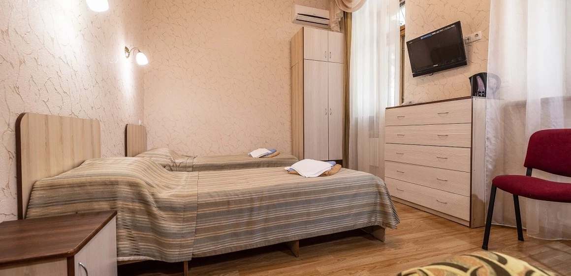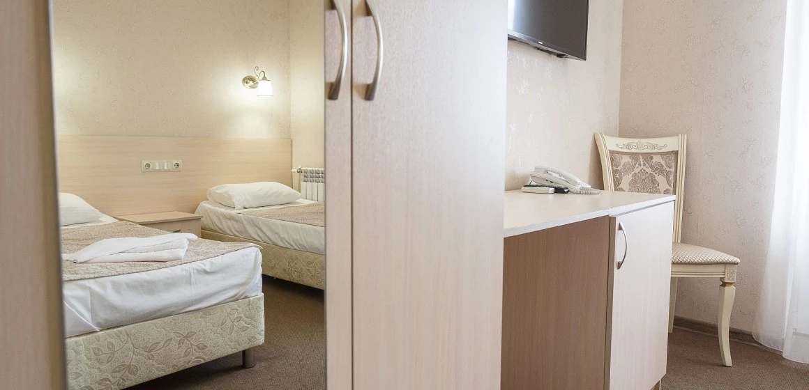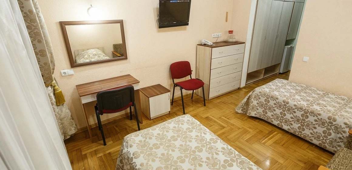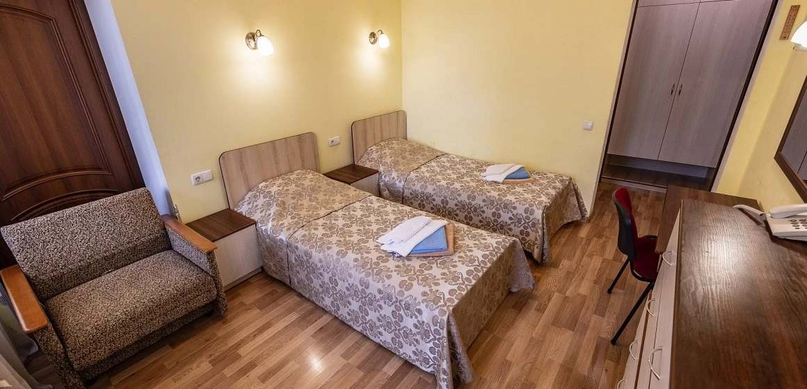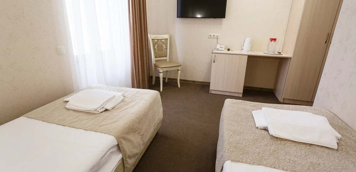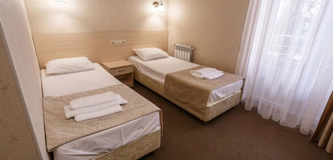 Площадь номера — 14–19 кв. м. В номере: две односпальные кровати, мебель (тумбочка, шкаф, стол), кондиционер, холодильник, телевизор, Wi-Fi в номере, ванная комната с ванной, фен, набор банных принадлежностей. Номера без балкона.
