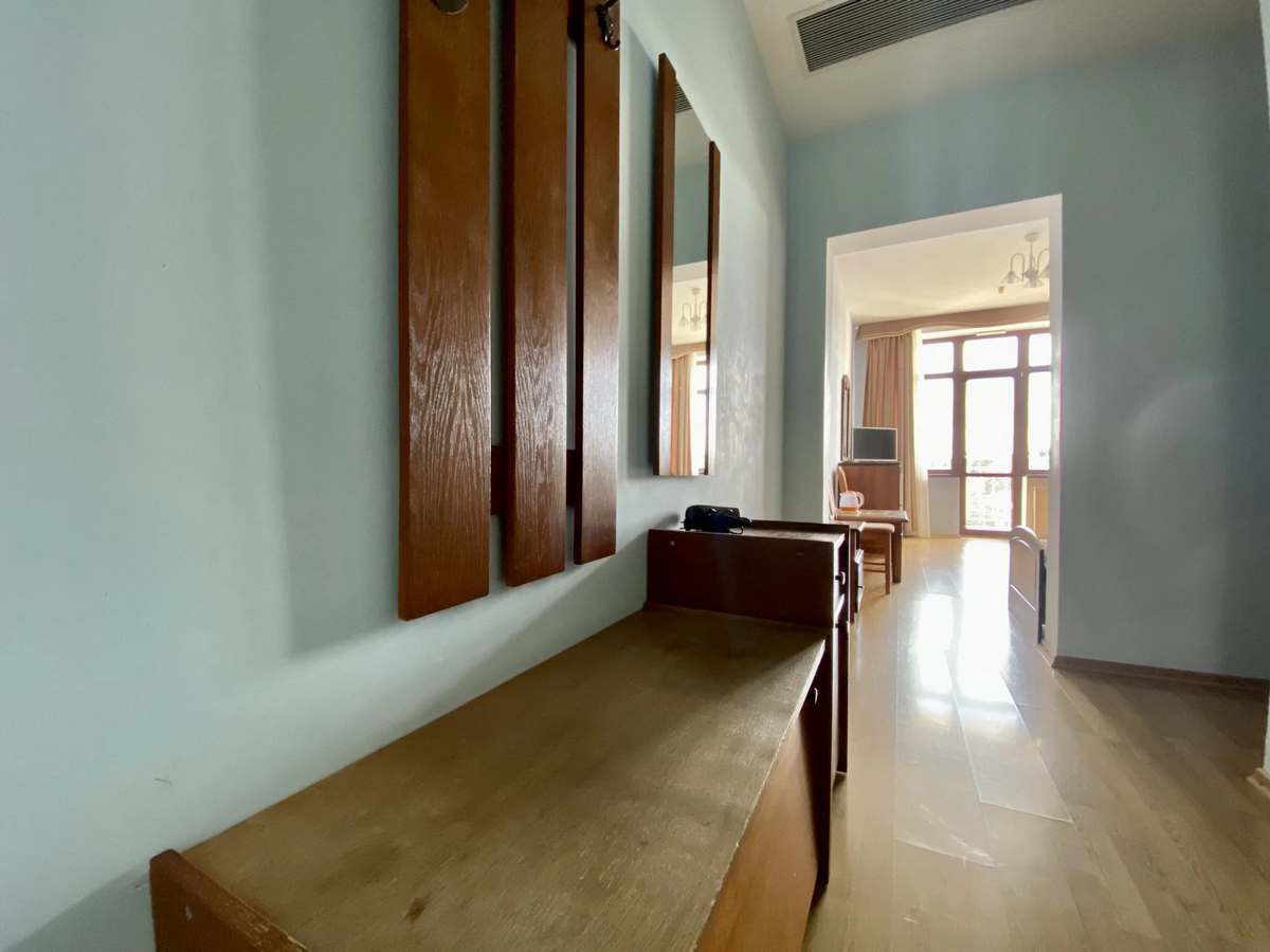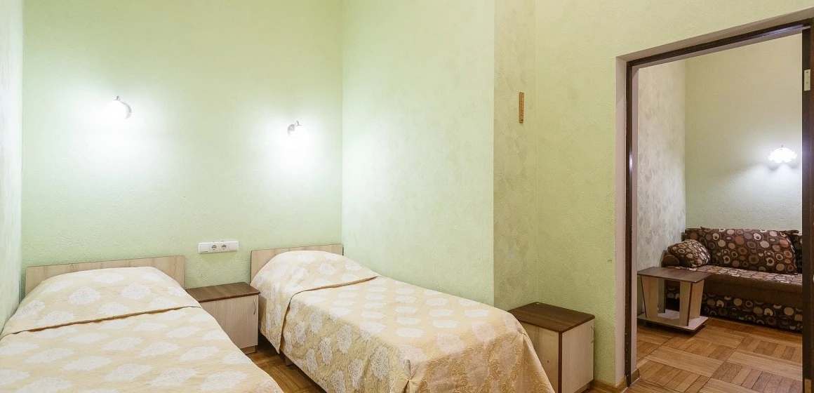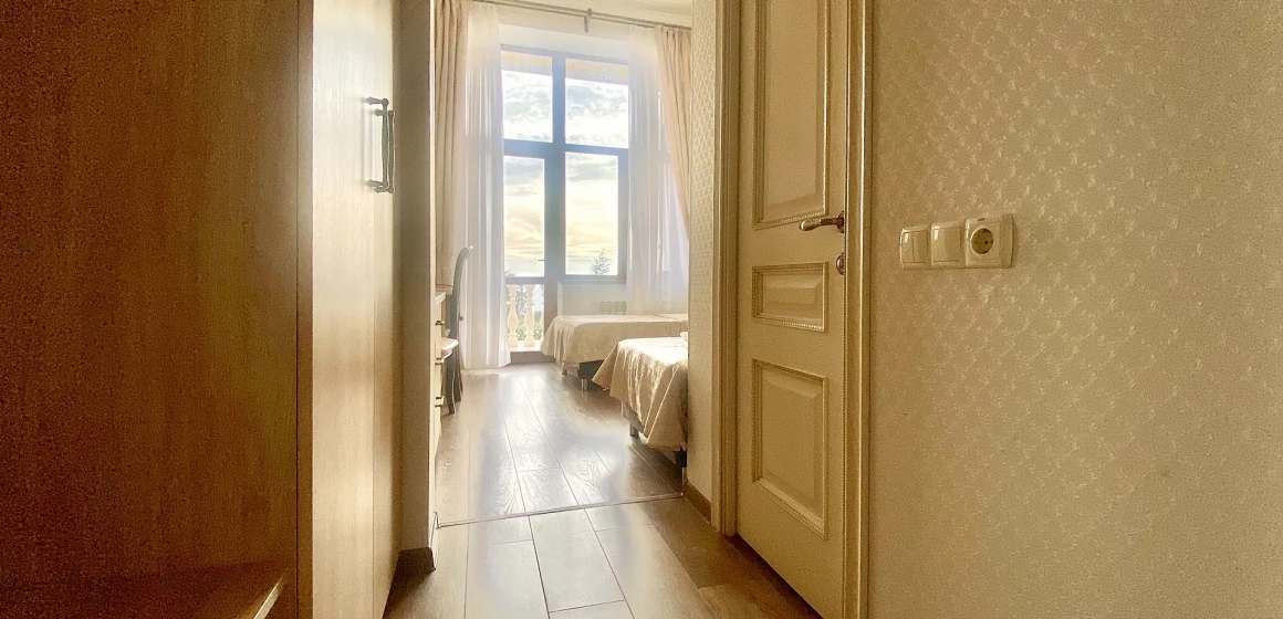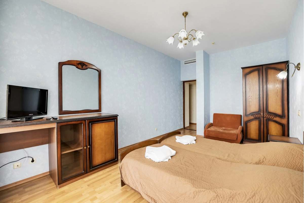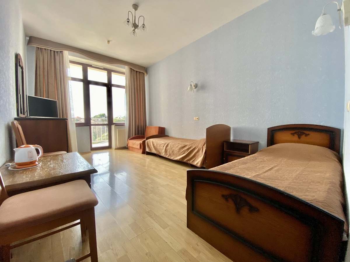 Площадь номера — 60 кв. м. В номере: одна или две односпальных кровати, набор мебели (тумбочка, шкаф, столик), санузел с душем, полотенцесушитель, телевизор, холодильник, сплит-система. Номер с балконом, вид на море или на горы, а также на парк санатория.