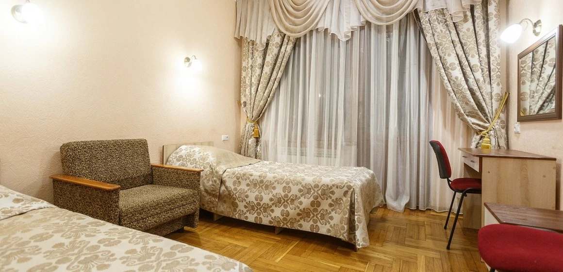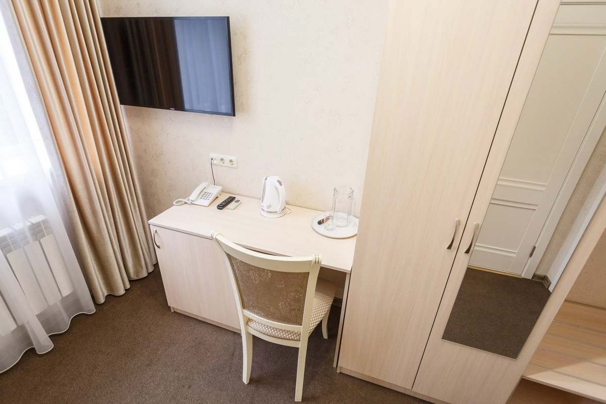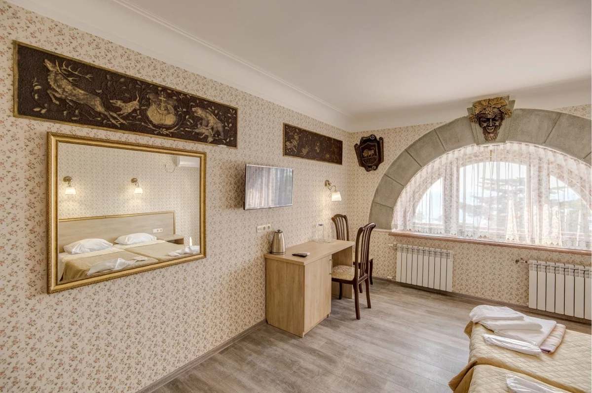 Площадь номера — 18,4 кв. м. В номере: одна двуспальная или две односпальные кровати, мебель (тумбочка, шкаф, стол), кондиционер, холодильник, телевизор, Wi-Fi в номере, ванная комната с душем, фен, набор банных принадлежностей. Номера без балкона, вход — с винтовой лестницы, вид на парк санатория.