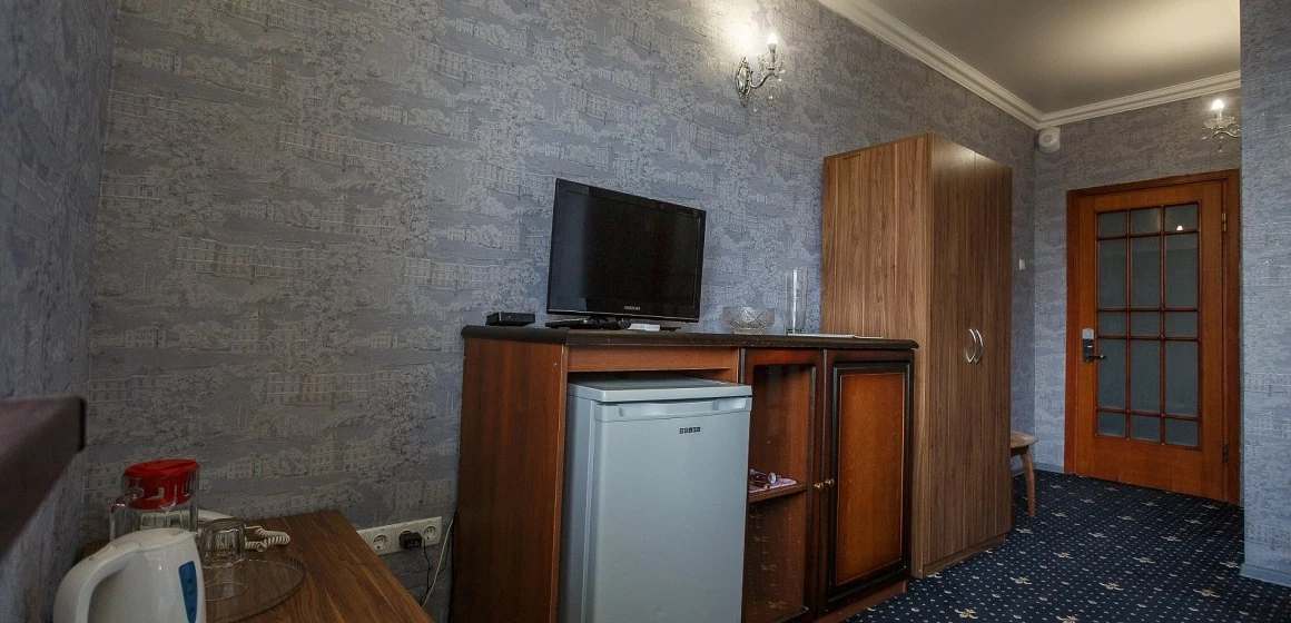 Площадь номера — 22 кв. м. В номере: одна односпальная кровать, набор мебели (тумбочка, шкаф, стол, стул), санузел, душ, полотенцесушитель, телевизор, холодильник; кондиционер. Номера без балкона с видом на море.