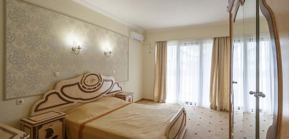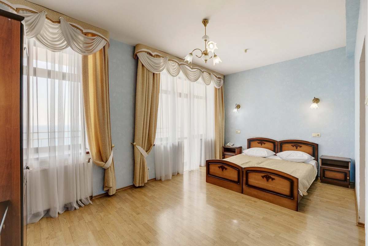 Площадь номера — 35-41 кв. м. В номере: двуспальная или две односпальные кровати, мягкая мебель (раскладные диваны, кресла), кондиционер, холодильник, телевизор, Wi-Fi в номере, электрочайник, чайная посуда, гладильная доска, утюг, ванная комната с ванной, фен, набор банных принадлежностей. Номера с балконом с видом на море.
