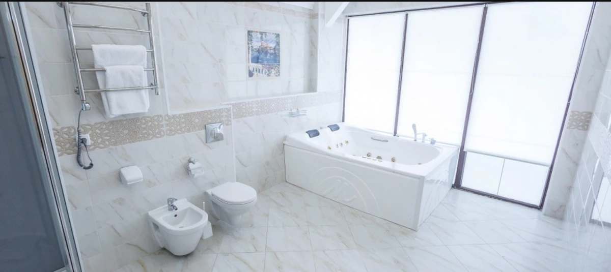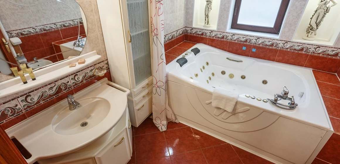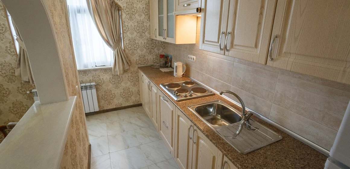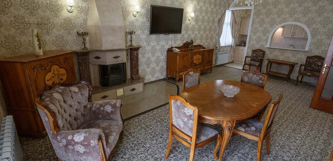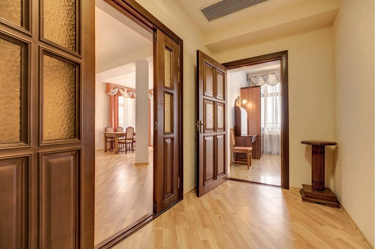 Площадь номера — 125 кв. м. В номере: две двуспальные кровати, две ванных комнаты, кухня, прихожая, гостиная, изящная и уютная мебель, кабельное телевидение, холодильник, кондиционер, фен, утюг, гладильная доска. В номере два балкона.