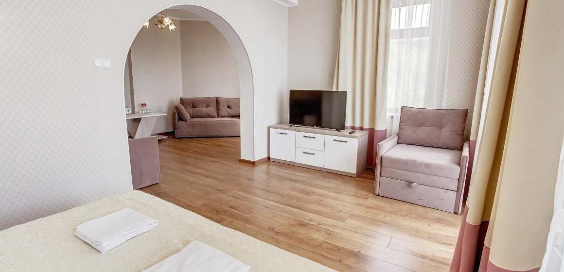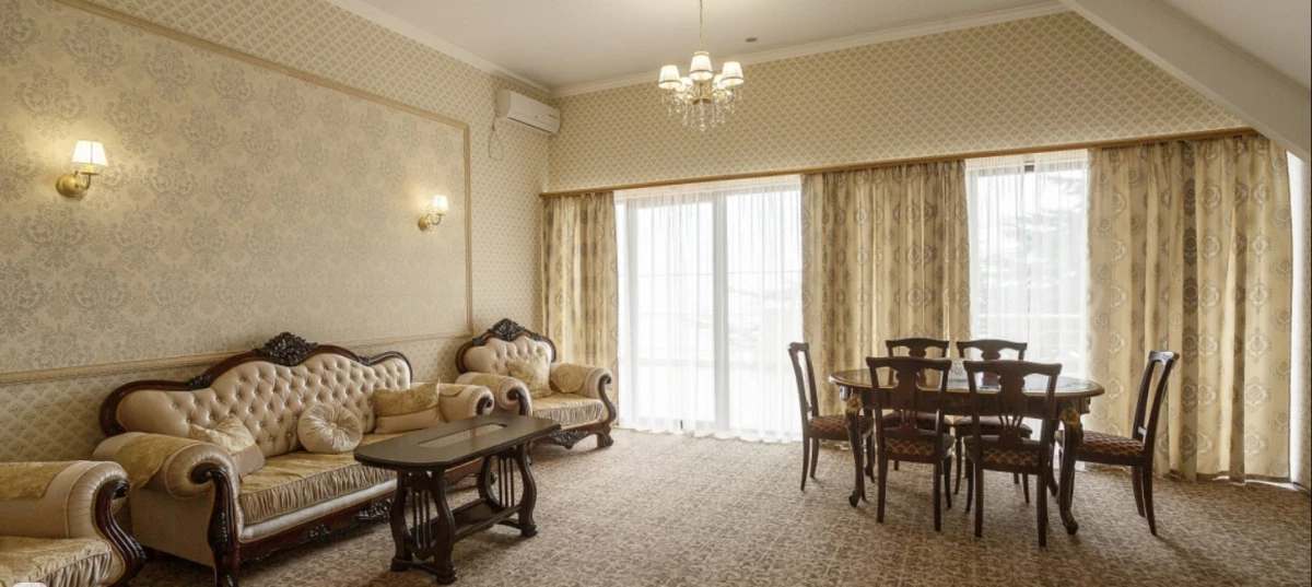Площадь номера — 47–89 кв. м. В номере: две двуспальные кровати, мягкая мебель, сплит-система, холодильник, телевизор, Wi-Fi в номере, электрочайник, набор посуды, гладильная доска, утюг, ванная комната с душем или ванной, фен, набор банных принадлежностей. Номер с балконом с видом на горы или море, парк санатория.