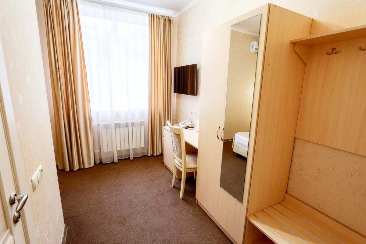 Площадь номера — 10–12 кв. м. В номере: одна односпальная кровать; набор гостиничной мебели (тумбочка, шкаф, стол, стул); санузел, душ, полотенцесушитель; телевизор; холодильник; кондиционер. Номера с балконом, вид на парк, море.