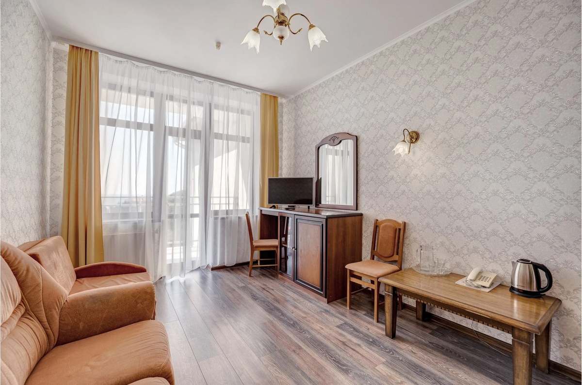 Площадь номера — 25–34 кв. м. В номере: двуспальная или две односпальные кровати, мягкая мебель (диван, кресло, бра), кондиционер, холодильник, телевизор, Wi-Fi в номере, электрочайник, чайная посуда, гладильная доска, утюг, ванная комната с душевой кабиной, фен, набор банных принадлежностей. Номер с балконом, вид на море или на горы, на парк санатория.