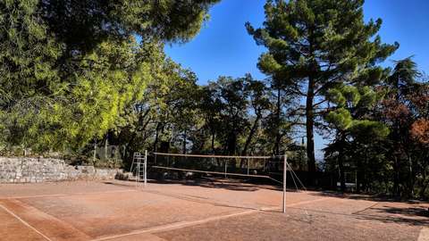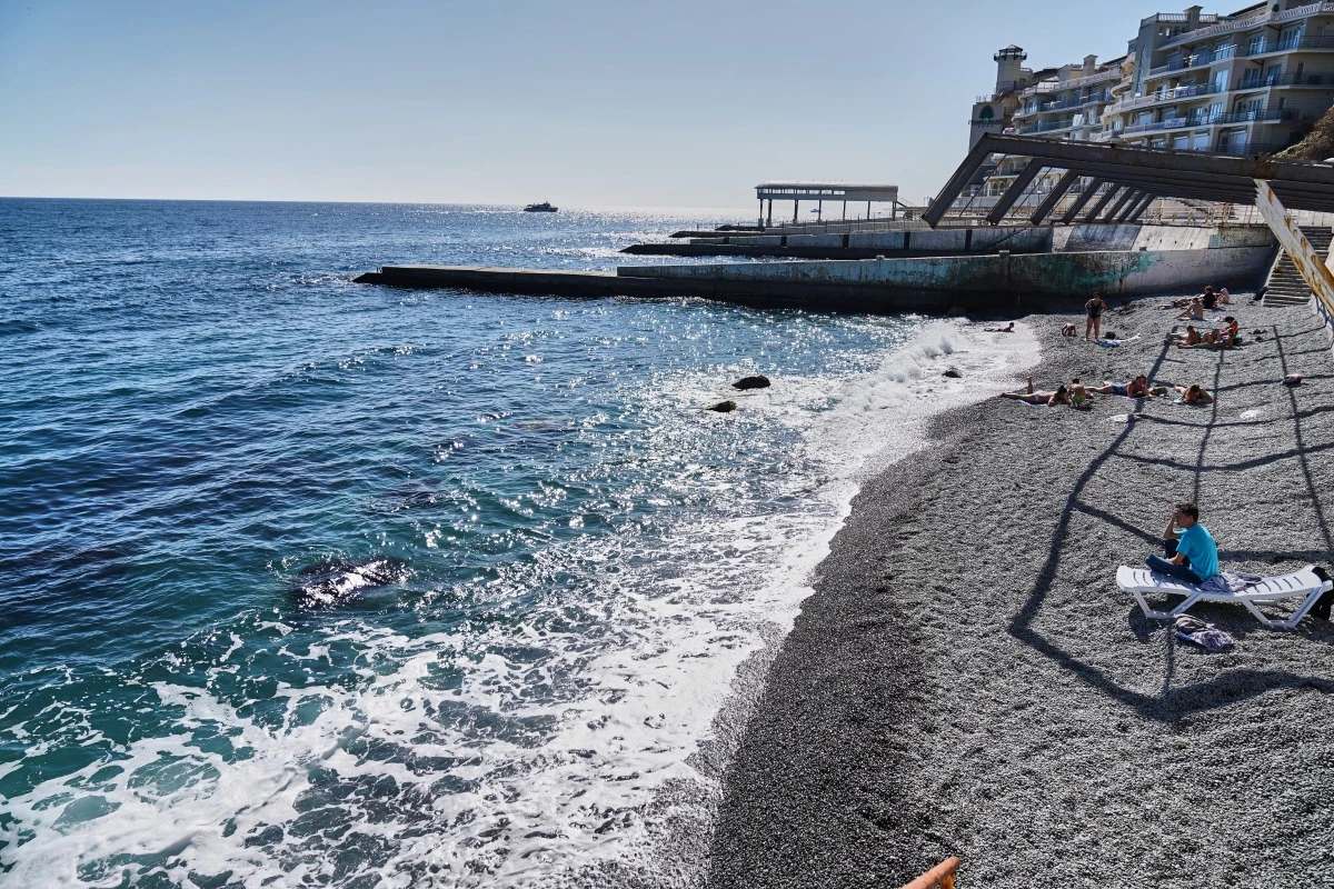 Собственный благоустроенный галечный пляж. Три карты пляжа, оборудованы навесами. Спуск к пляжу на обственной канатной дороге (время в пути — около 3 минут). На пляже есть лодочная станция и бар.