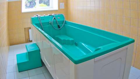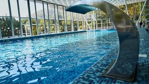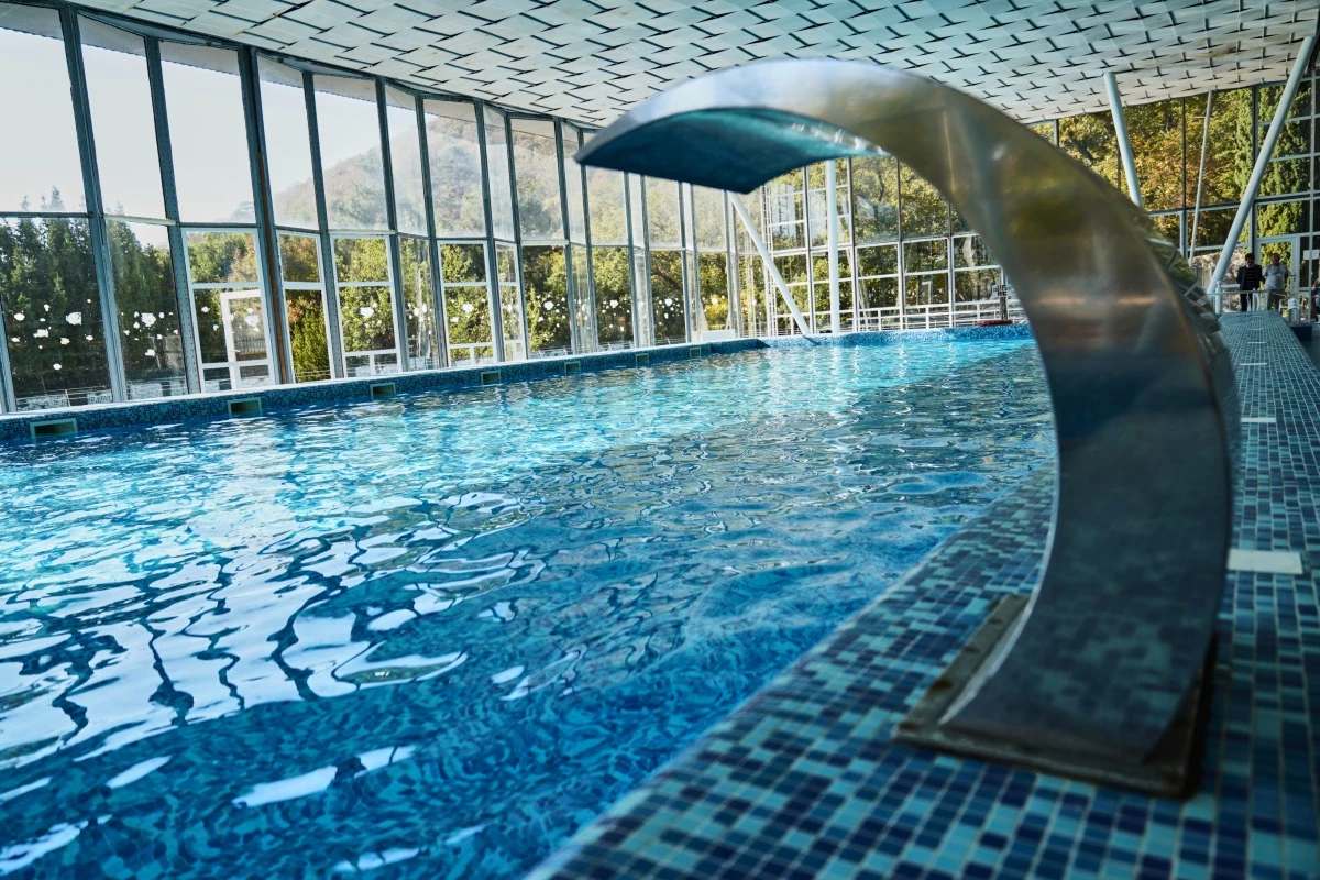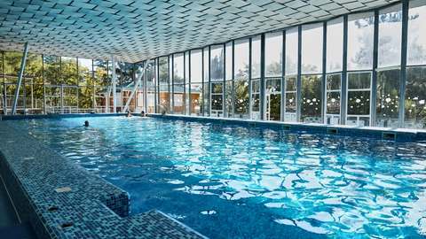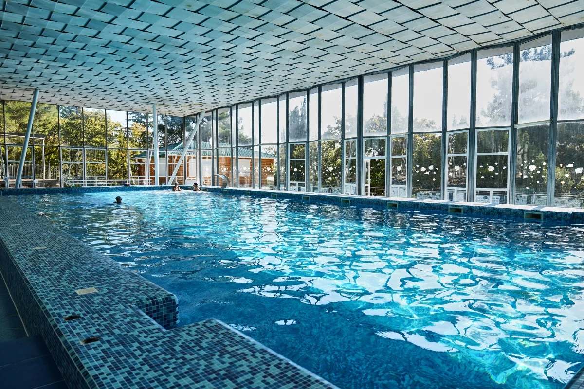 Крытый бассейн с подогреваемой морской водой и окнами с видом на сосновый бор.