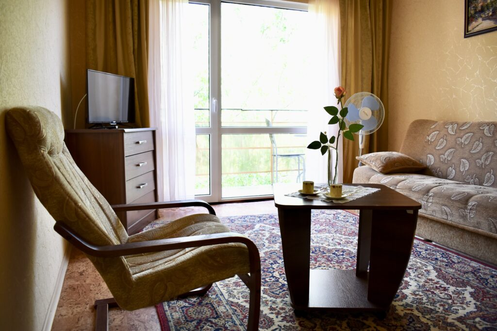 2-комнатные номера с удобствами (совмещенный санузел: умывальник, душевая кабинка, туалет, фен). В номере: спальня — двуспальная кровать, тумбочки, шкаф, кондиционер, сейф; гостиная — раскладной диван, столик, телевизор, холодильник, балкон с летней мебелью с боковым видом на море или видом на парк. Расположены на 2—3-м этажах в корпусах 1, 2. Площадь 25 кв. м. Дополнительное место – раскладной диван в гостиной.