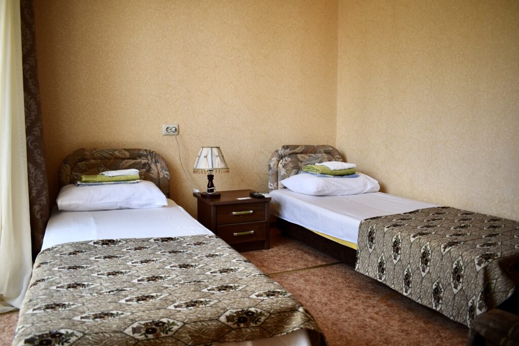 2-местные 1-комнатные номера с удобствами (совмещенный санузел: умывальник, душевая кабинка, туалет, фен). В номере: 2 раздельные кровати, тумбочки, шкаф, холодильник, ТВ, кондиционер. Расположены на 1-м этаже в корпусах 1, 2. Без балкона. Площадь 14 кв. м. Дополнительное место – еврораскладушка или кресло-кровать. Из номеров вид на парковую территорию. Смена белья и полотенец: каждый 4-й день или по требованию гостя.
