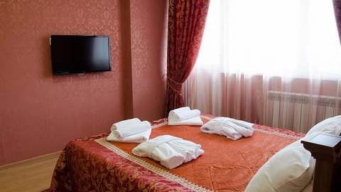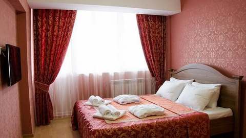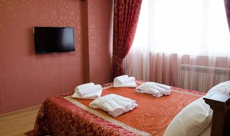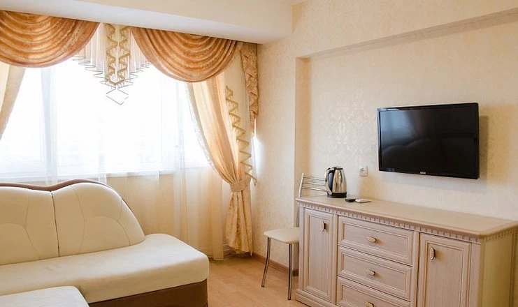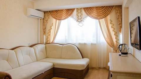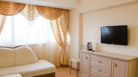 Площадь номера: 36 кв. м. В номере: двуспальная кровать, холодильник, телевизор, зеркало, мягкий уголок, стол, стулья, тумбы, шкаф для одежды, фен, электрочайник, кондиционер, совмещенный санузел (душевая кабинка), балкон. Дополнительное место: диван.
