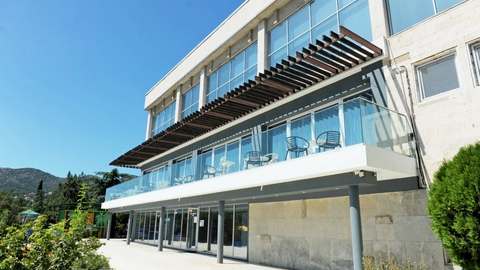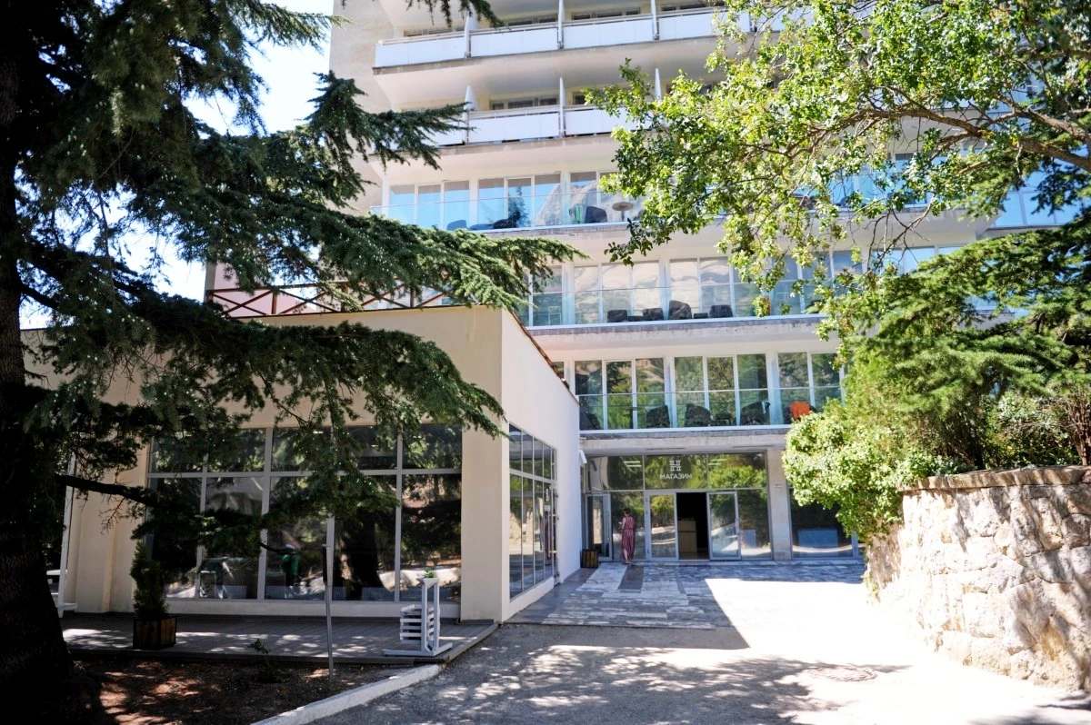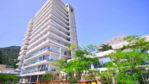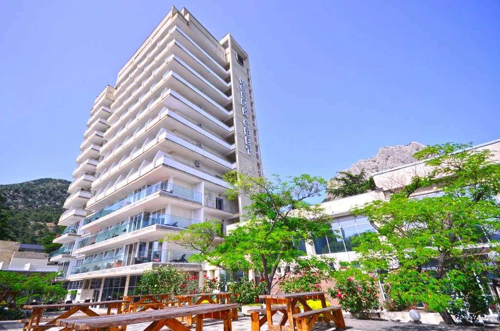 - Центральный корпус — 12-этажное здание на 153 номера, лифт, 250 метров до набережной и пляжа. Панорамный вид на море, парк, поселок и горы из большинства номеров.