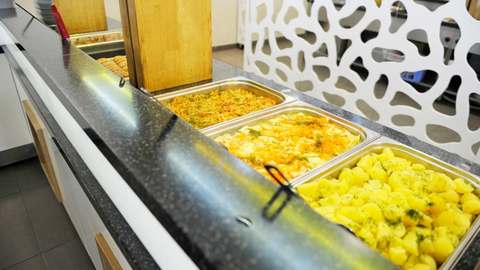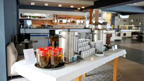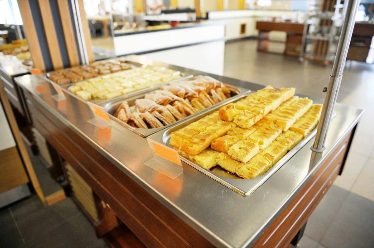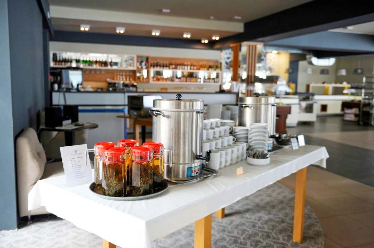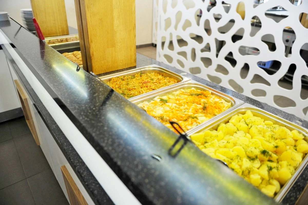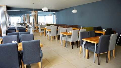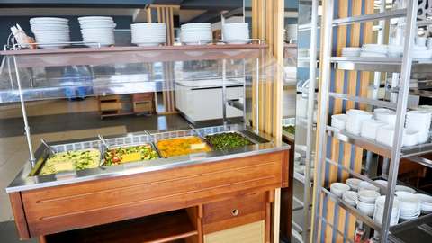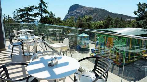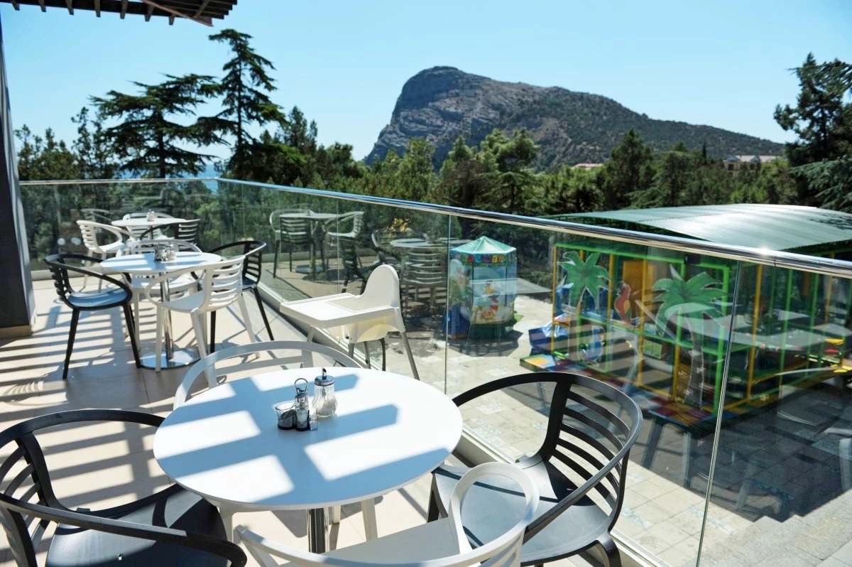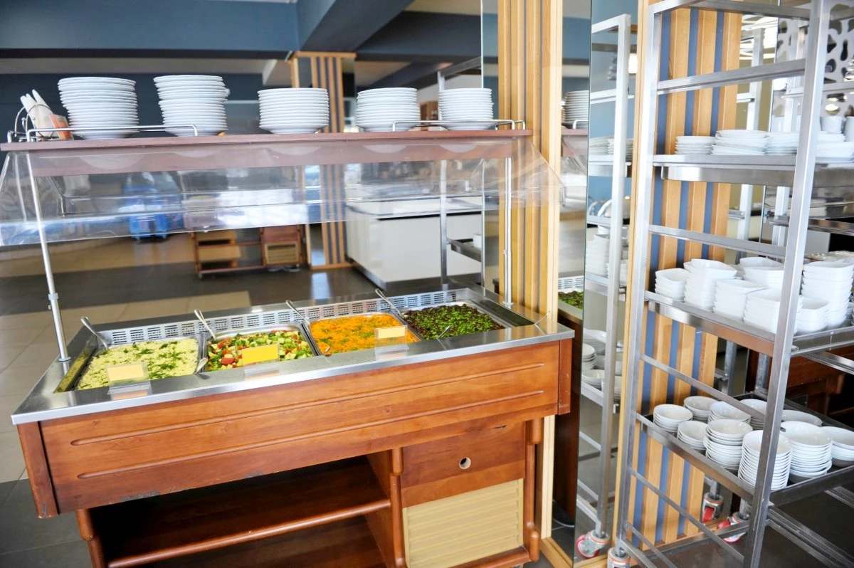 Завтраки или полный пансион (в зависимости от тарифа) по системе «шведский стол» в летний период или комплексному меню в межсезонье (с 01.10 по 30.04). Главный ресторан гостиничного комплекса расположен на 1-м этаже центрального корпуса — просторный капитально отремонтированный кондиционированный зал и летняя площадка на открытом воздухе.