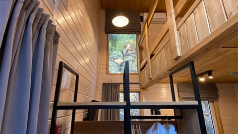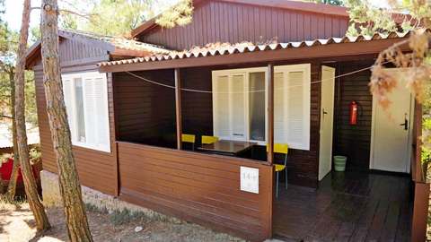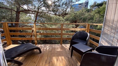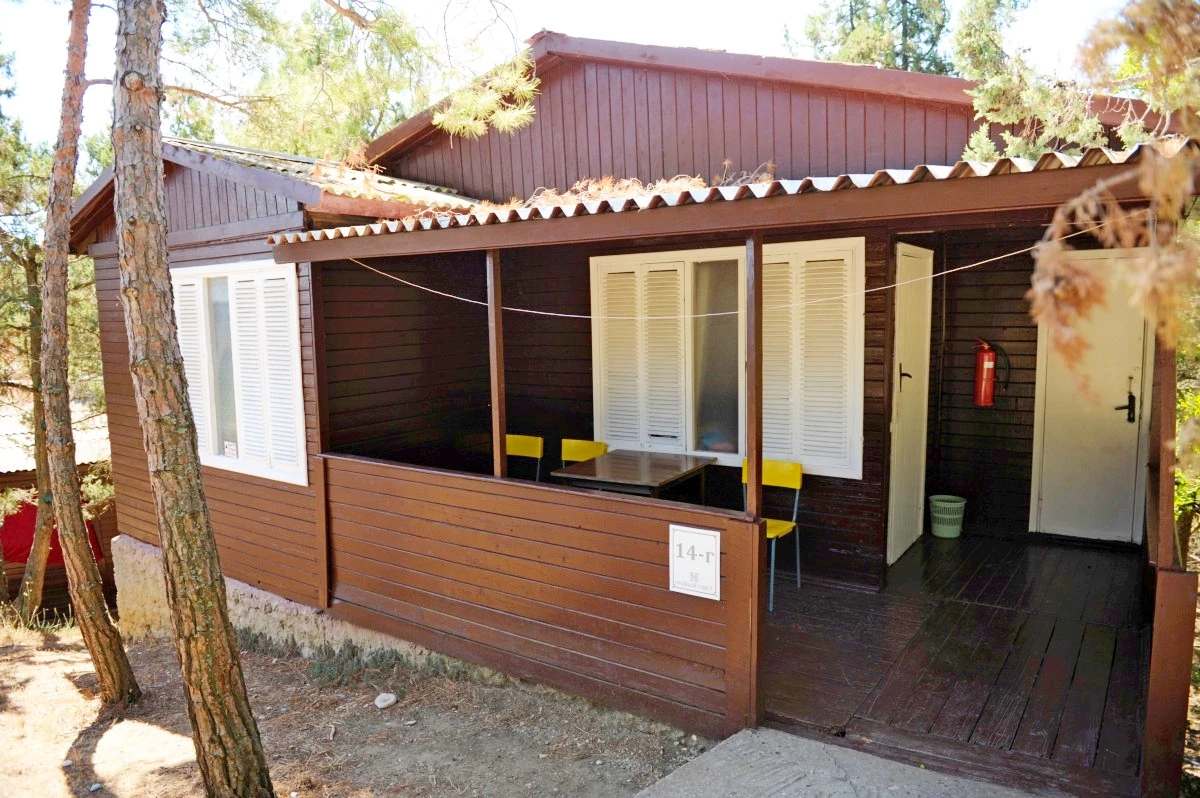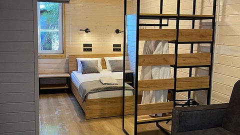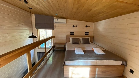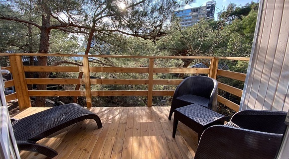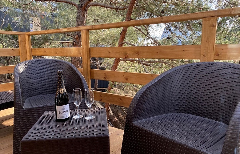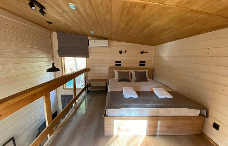 2-комнатный 2-этажный каркасный домик с мебелированной верандой. Площадь: 29 кв. м. Комнаты не изолированы, спальня находится над гостиной. В номере: двуспальная кровать, прикроватные тумбы, раскладной диван, ТВ в гостиной зоне напротив дивана, мини-холодильник, сушилка, чайник, набор посуды (стаканы, ложки, вилки, ножи), интернет (Wi-Fi), кондиционер, сейф, фен, бойлер; санузел с душем, мини-набор парфюмерии, банные и пляжные полотенца. Размещение: 4 человека + 1 ребенок до 7 лет (без места) + 1 ребенок до 3 лет. Номер с открытой террасой с двумя креслами и столиком. Дополнительное место — диван.