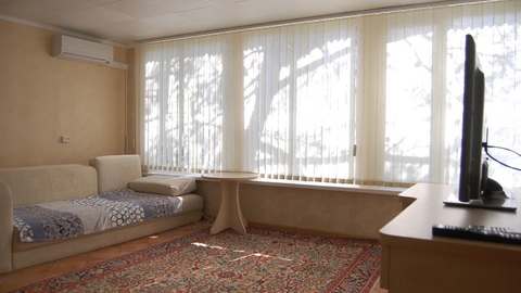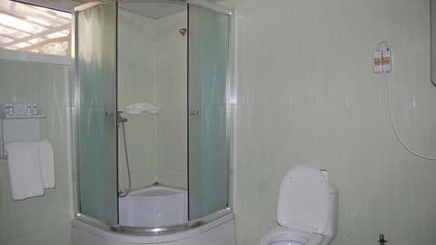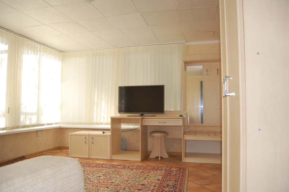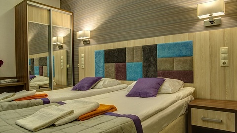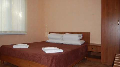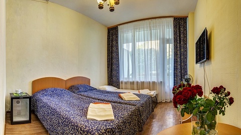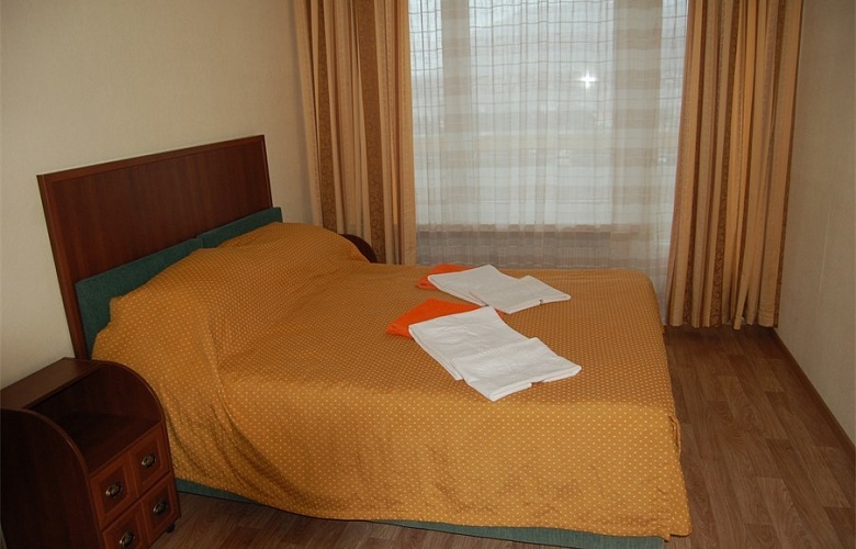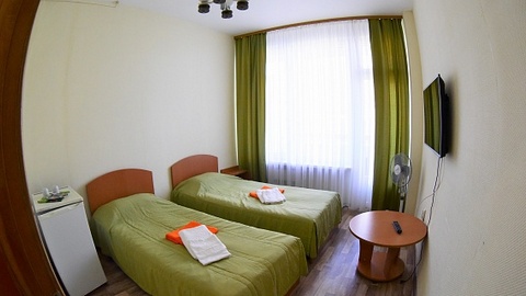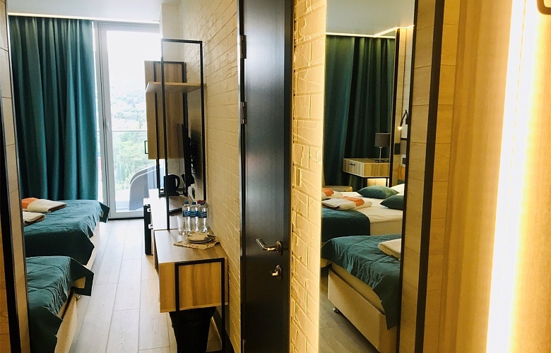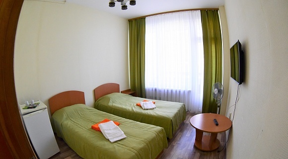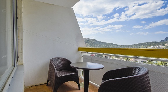Площадь номера: 12 кв. м. В номере: две раздельные кровати, тумбы, шкаф для одежды, вешалки, зеркало, журнальный столик, вентилятор, телевизор с кабельным ТВ, Wi-Fi, холодильник, набор посуды, чайник и фен — по запросу за дополнительную плату (50 р./сут.) Санузел: душевая кабина, унитаз, раковина, банные полотенца, мини-набор парфюмерии (пополняется ежедневно). Балкон, вид на море или горы. Дополнительное место: раскладушка. Номера расположены с 7-го по 12-й этаж.