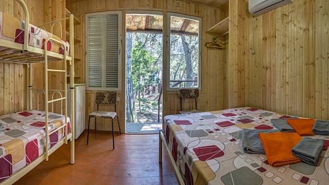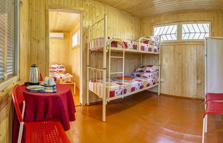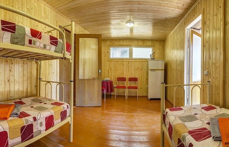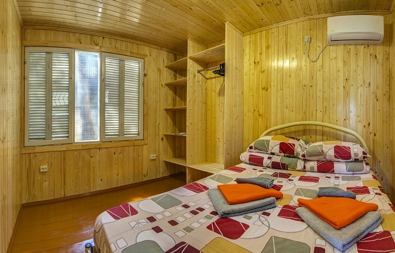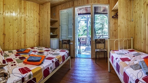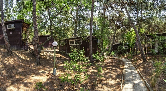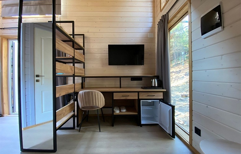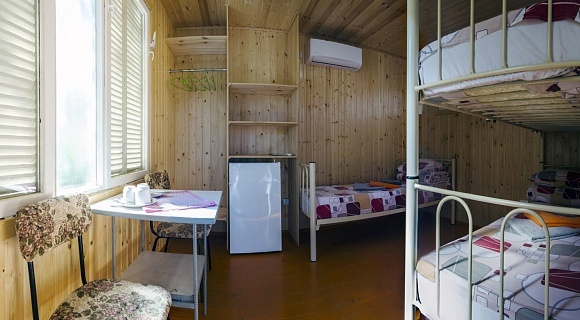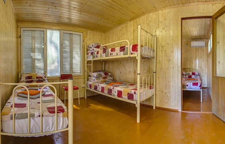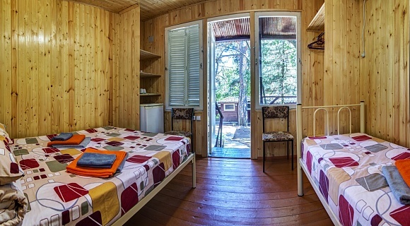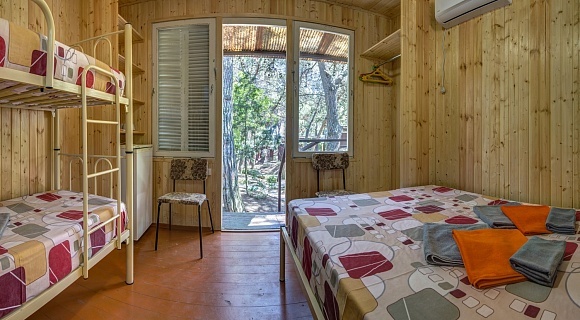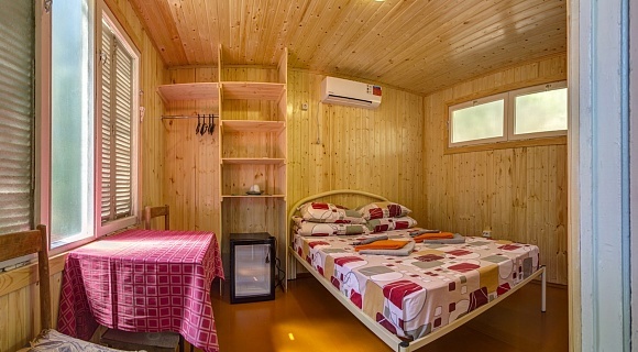 Площадь: 20 кв. м. В домике: одна полутороспальная кровать, две односпальные кровати, шкаф для одежды, вешалки, зеркало, обеденный стол, стулья, чайник, набор посуды (стаканы, ложки, вилки, нож), кондиционер, холодильник, фен — по запросу за дополнительную плату (50 р./сут.) Санузел с душевой кабиной, унитазом, раковиной (вход в санузел с террасы), набор полотенец, мини-набор парфюмерии (пополняемый ежедневно). Номер с террасой. Вид на парк. Дополнительные места — двухярусная кровать. Размещение до 6 человек.