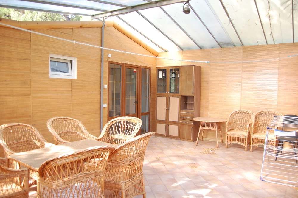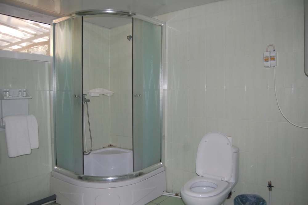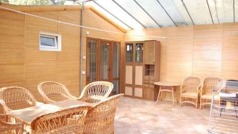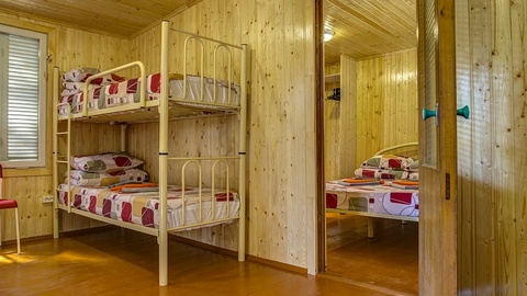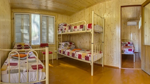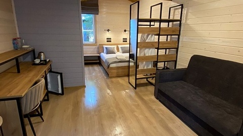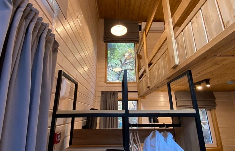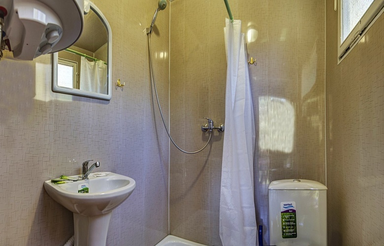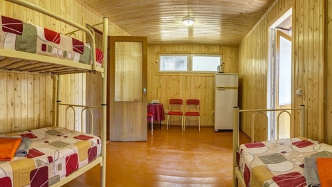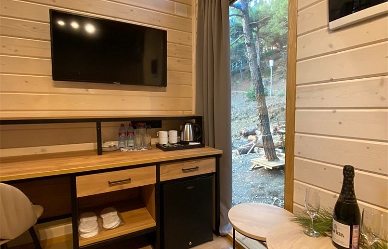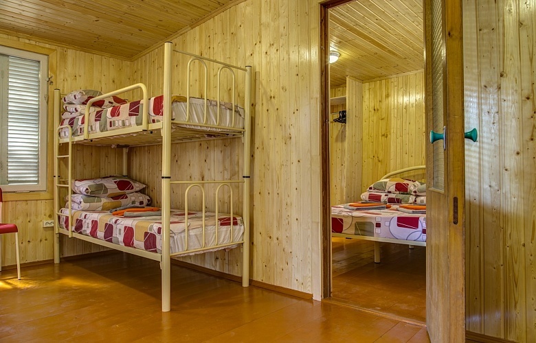 Площадь: 20 кв. м. В домике: одна полутороспальная кровать, две односпальные кровати, шкаф для одежды, вешалки, зеркало, обеденный стол, стулья, чайник, набор посуды (стаканы, ложки, вилки, нож), кондиционер, холодильник, фен — по запросу за дополнительную плату (50 р./сут.) Санузел с душевой кабиной, унитазом, раковиной (вход в санузел с террасы), набор полотенец, мини-набор парфюмерии (пополняемый ежедневно). Номер с террасой. Вид на парк. Дополнительные места — двухярусная кровать. Размещение до 6 человек.