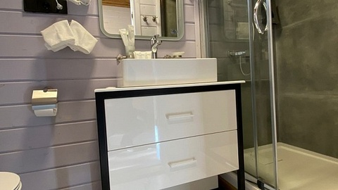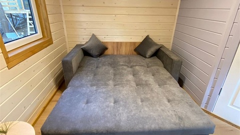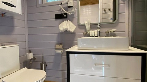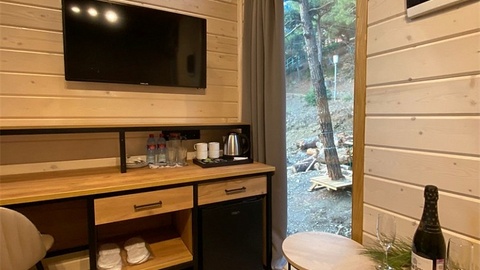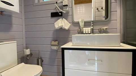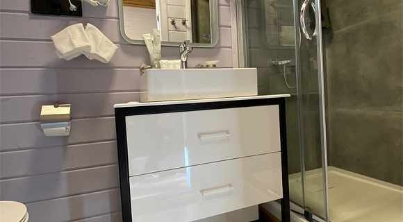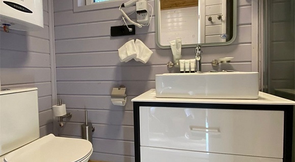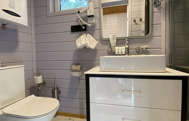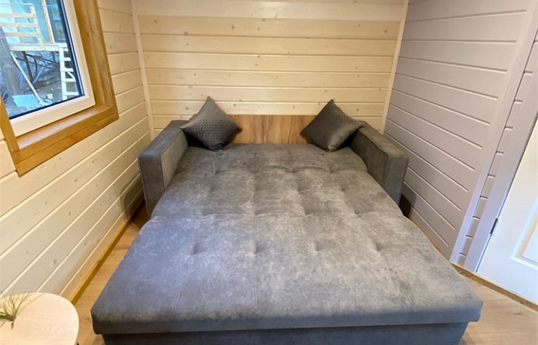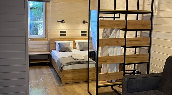 Каркасный домик с мебелированной верандой. Площадь: 27 кв. м. В номере: двуспальная кровать, прикроватные тумбы, раскладной диван, ТВ в гостиной зоне напротив дивана, мини-холодильник, сушилка, чайник, набор посуды (стаканы, ложки, вилки, ножи), интернет (Wi-Fi), кондиционер, сейф, фен, бойлер, мини-набор парфюмерии, в санузле — душ, туалет, умывальник, банные и пляжные полотенца. Размещение: 4 человека + 1 ребенок до 7 лет (без места) + 1 ребенок до 3 лет.