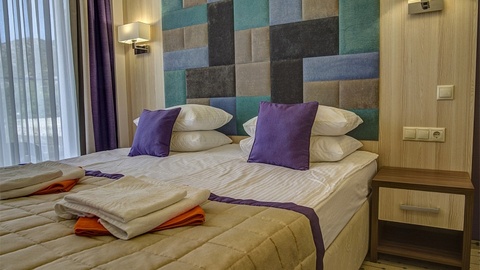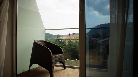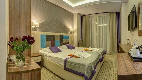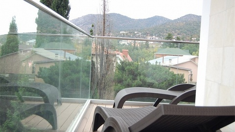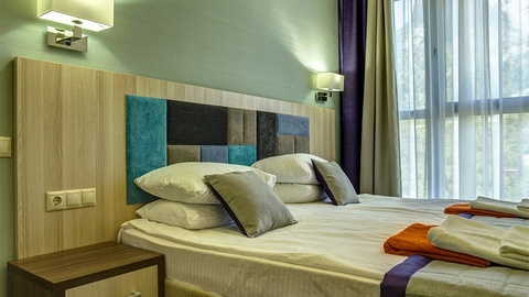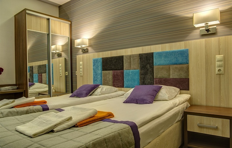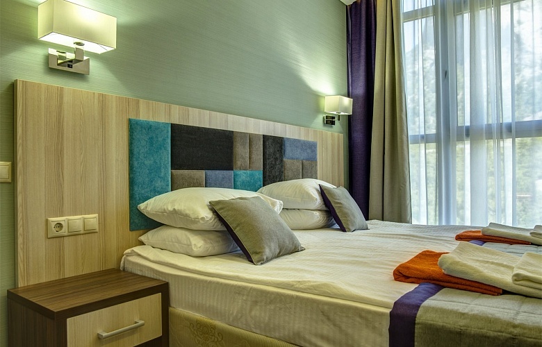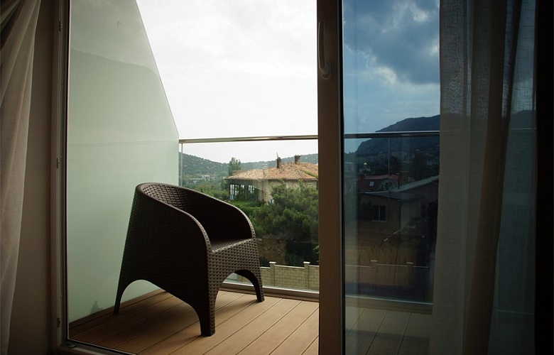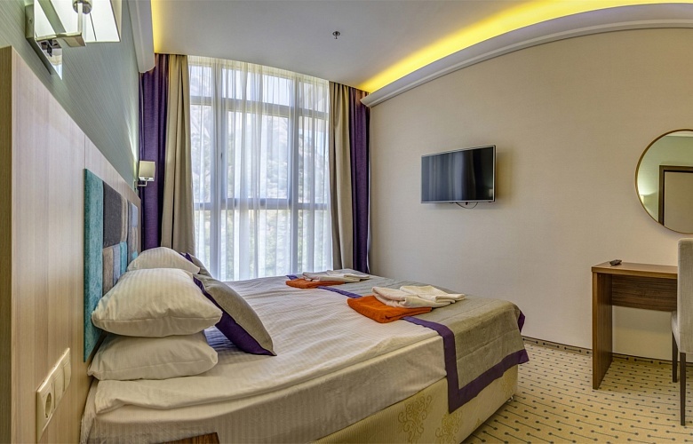 Площадь номера: 27 кв. м. В номере: в спальне — двуспальная кровать, прикроватные тумбы; в гостиной — двуспальный диван, шкаф для одежды, вешалки, зеркало, сейф, телевизор, холодильник, электрочайник, кондиционер, бойлер, мини-холодильник, балкон с видом на море и горы. Номер с удобствами: туалет, умывальник, фен, душевая кабина. Номера расположены с 7-го по 11-й этаж. Дополнительное место — диван либо раскладушка.