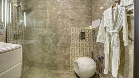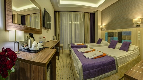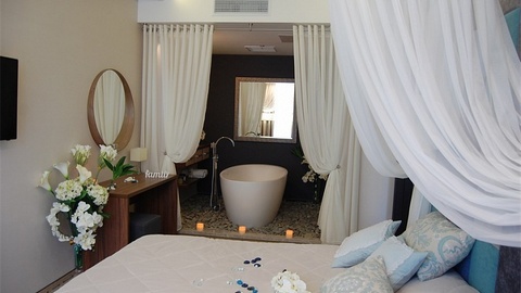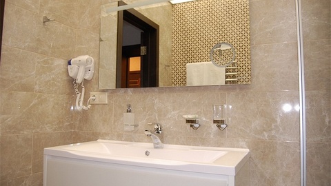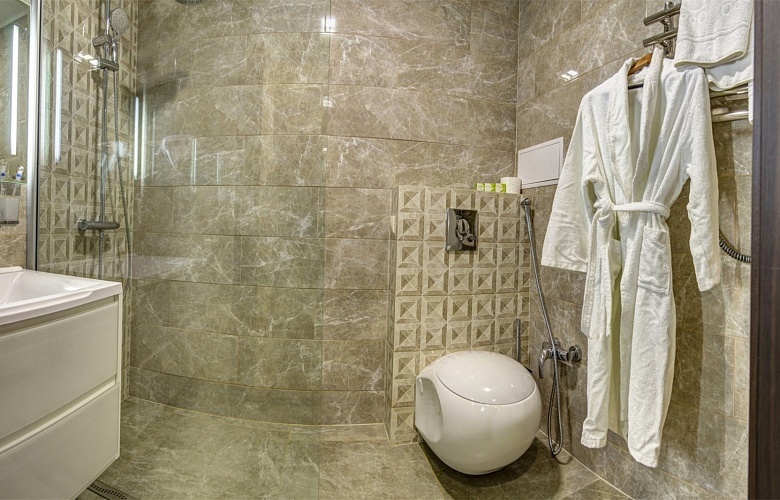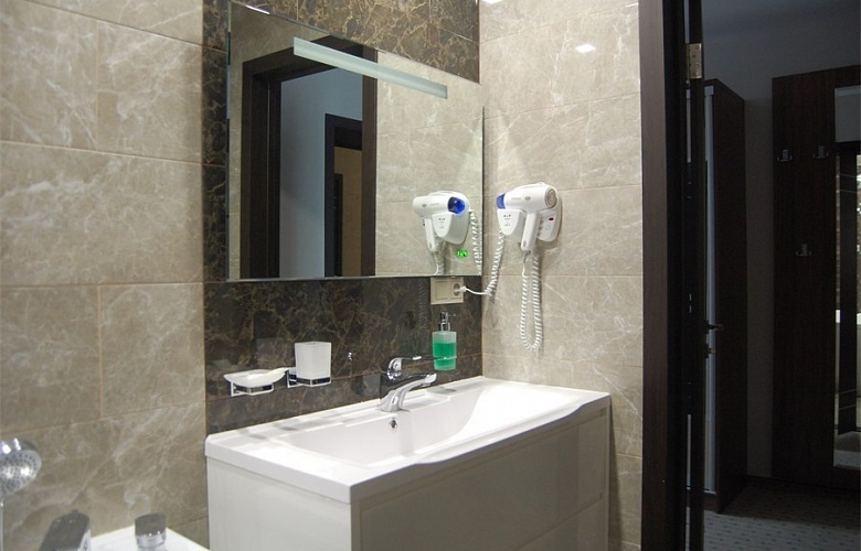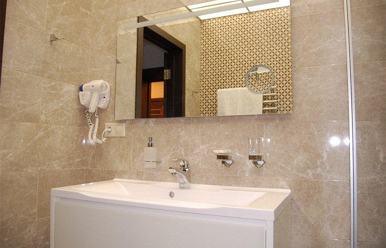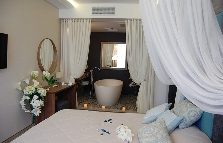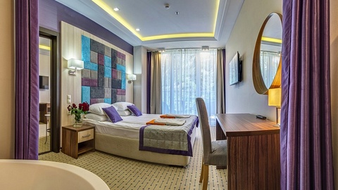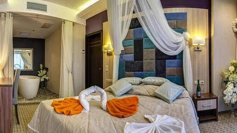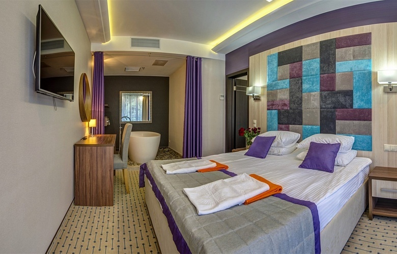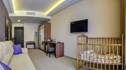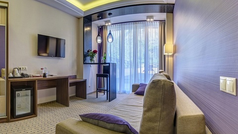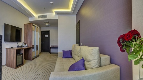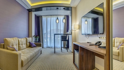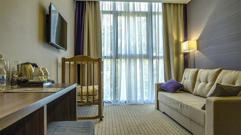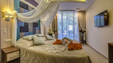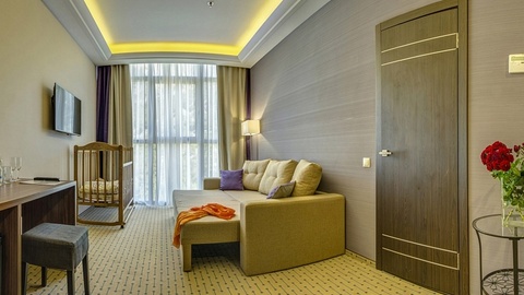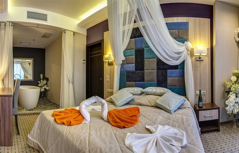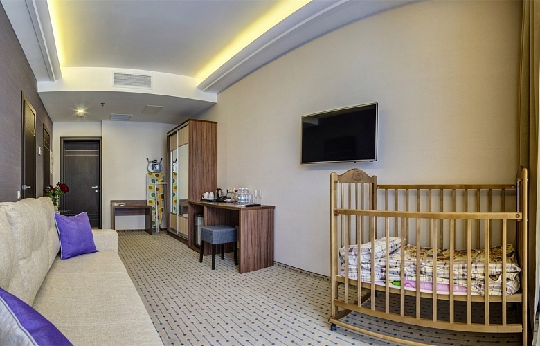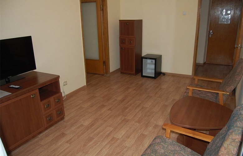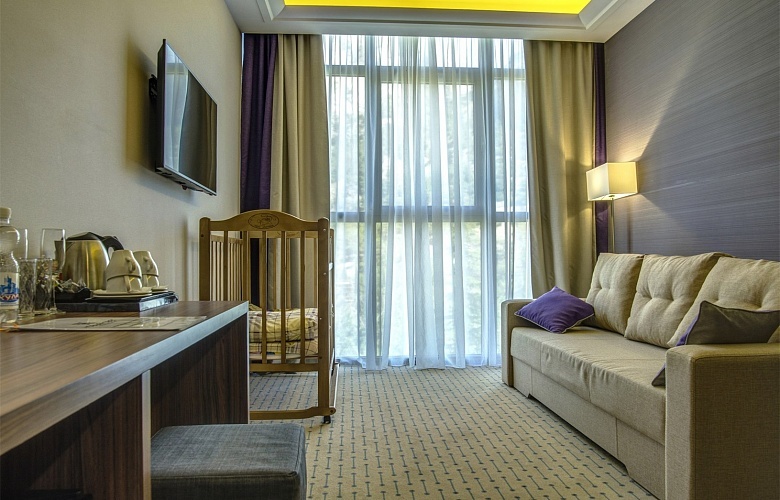 Площадь номера: 32 кв. м. В номере: в спальне — две сдвинутые кровати, прикроватные тумбы; в гостиной — двуспальный диван, шкаф для одежды, вешалки, зеркало, багажная тумба, пуфики, кресло, стул, журнальный столик, письменный стол, телевизор с плоским экраном, кондиционер, холодильник, бойлер, мини-холодильник, сейф. Номер с удобствами: туалет, умывальник, ванна, фен, туалетные принадлежности, банные и пляжные полотенца, тапочки, халаты. Wi-Fi. Номера расположены со 2-го по 6-й этаж. Дополнительное место — раскладушка. Детям до 3 лет в номер может быть предоставлена детская кроватка (бесплатно, при наличии).