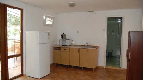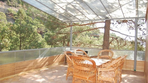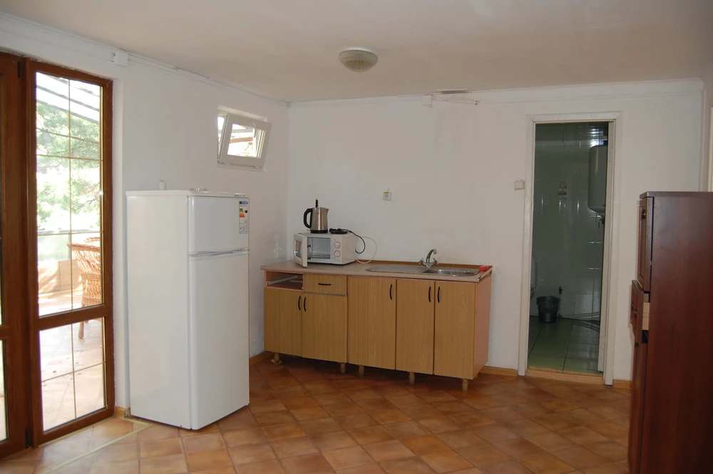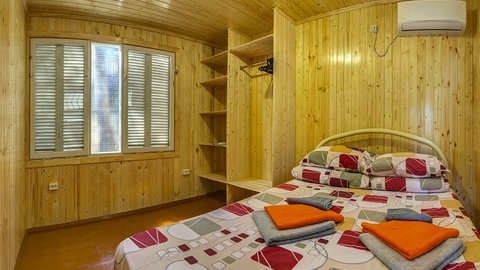 Трехкомнатный дом, состоящий из 2 спален, мини-кухни, гостиной и большой террасы. Площадь: 45 кв. м. В домике: по две односпальные кровати в каждой спальне, в гостиной — диван, кресла, мебельный гарнитур, тумбы, шкаф для одежды, вешалки, зеркало, обеденный стол, стулья, журнальный столик, чайник, набор посуды (стаканы, ложки, вилки, ножи), микроволновая печь, кондиционер, холодильник, фен — по запросу за дополнительную плату (50 р./сут.) Санузел с душевой кабиной, унитазом, раковиной, набор банных и пляжных полотенец, косметические и гигиенические средства, тапочки, халаты. Номер с террасой. Вид на море. Расстояние до пляжа — 300 метров. Дополнительное место — раскладушка.