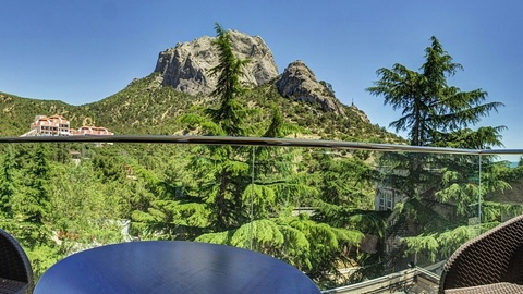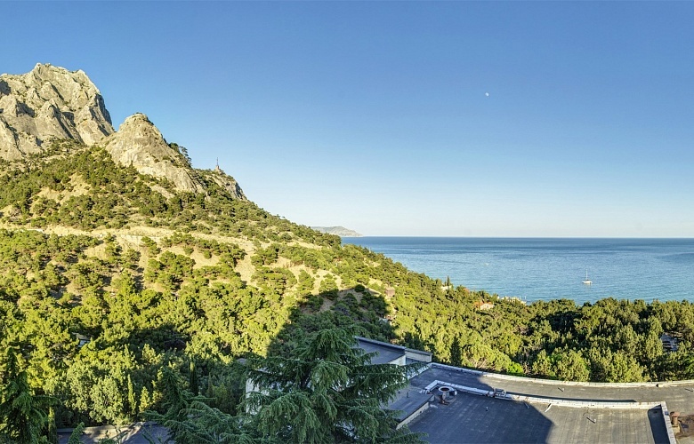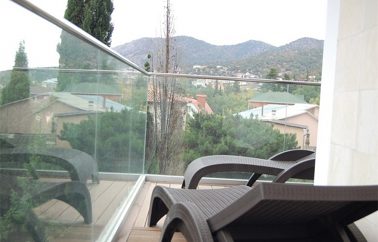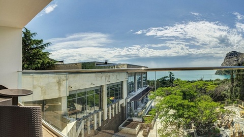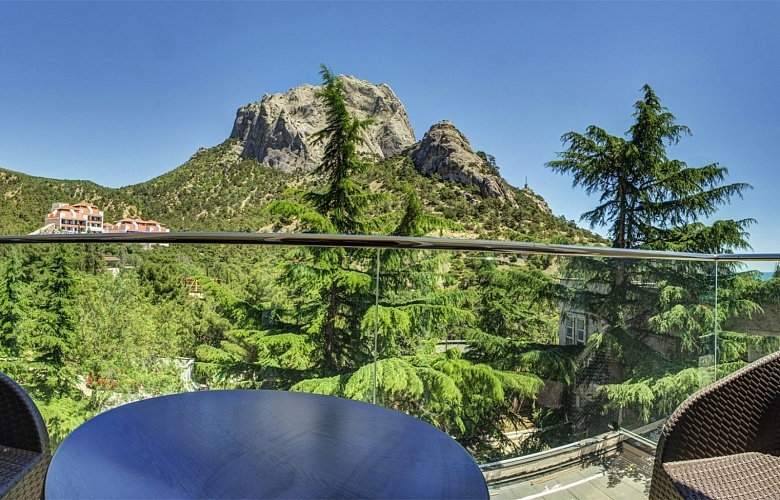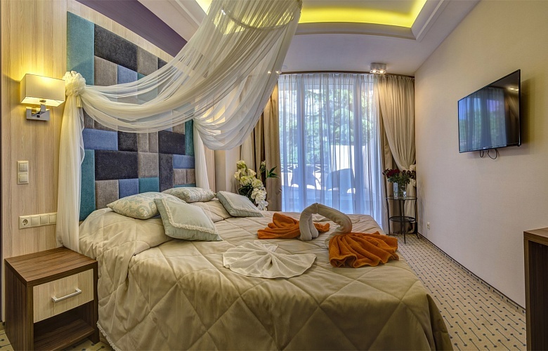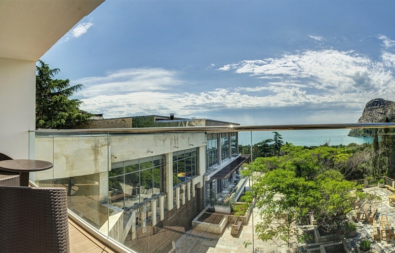 Площадь номера: 35 кв. м. В номере: в спальне — двуспальная кровать, ванная; в гостиной — двуспальный диван, тумбы, шкаф для одежды, вешалки, зеркало, кресла, письменный стол, пуфики, светильник, барная стойка, настольные лампы, сейф, набор посуды (стаканы, ложки, вилки, нож), электрочайник, чайный набор (чай и кофе пополняются ежедневно); 2 телевизора с кабельным ТВ, холодильник, кондиционер, Wi-Fi, фен. Ванная комната с ванной, унитазом, раковиной, банные и пляжные полотенца, халаты, тапочки, косметические средства. Номер с балконом, вид на море и боковой вид на гору Сокол. Дополнительные места: раскладной диванчик, раскладушка. Размещение до 4 человек. Номера расположены со 2-го по 4-й этаж.