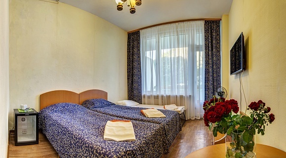 Площадь номера: 18 кв. м. В номере: две раздельные или сдвинутые кровати, шкаф для одежды, вешалки, зеркало, багажная тумба, сейф, кондиционер, телевизор с кабельным ТВ, Wi-Fi, мини-холодильник, чайник, набор посуды (стаканы, ложки, вилки, нож), фен. Санузел: душевая кабина, унитаз, раковина, банные полотенца, мини-набор парфюмерии (пополняется ежедневно), халат, тапочки. Номер с балконом, на балконе — два кресла и столик. Дополнительное место: раскладушка. Номера расположены со 2-го по 6-й этаж.