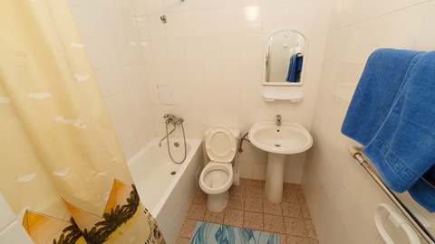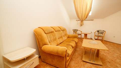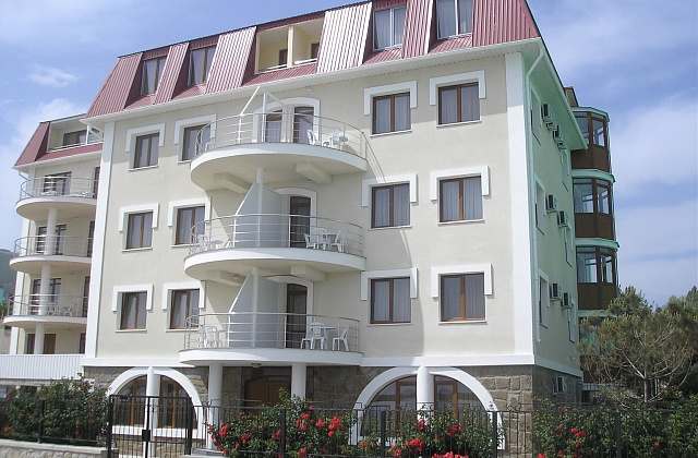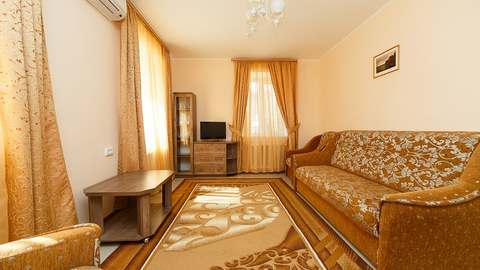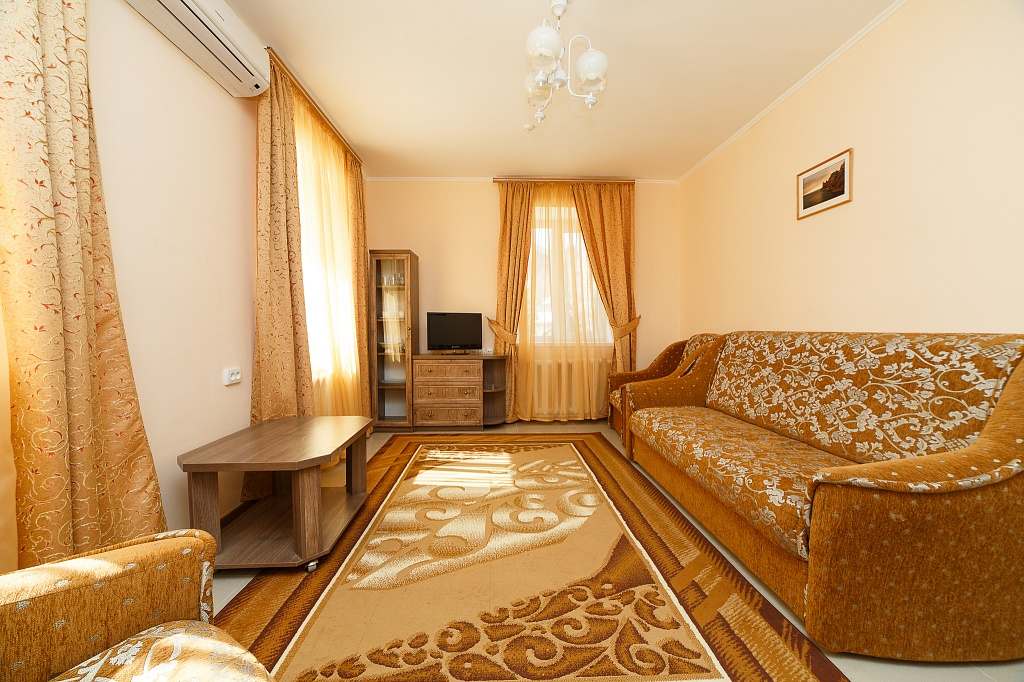 Номера с удобствами (совмещенный санузел с ванной). В номере: две спальни с 2-спальной и раздельными кроватями, диван в гостиной, телевизор, холодильник, кондиционер, набор мебели, большой балкон с видом на море. Дополнительные места: раскладной диван, кровати.