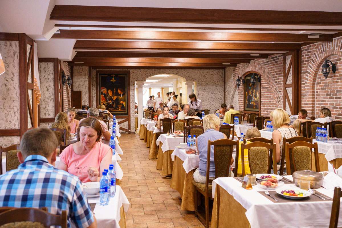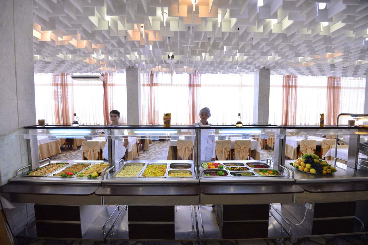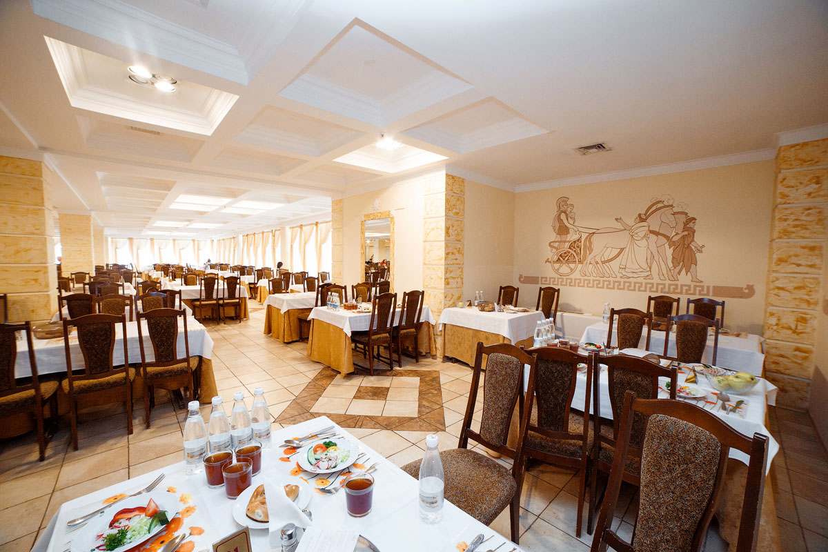 3-разовое. За гостями, проживающими в каждом корпусе закреплен определенный ресторан: корпус № 2 (все номера), 1-комнатные 2-местные номера корпусов 4, 6, 11, 5, административный корпус — кафе «Зимнее» (в сезон — заказное питание с элементами «шведского стола»); 1-местные номера корпусов 4, 11 и административного корпусов, 1-комнатные номера корпуса № 1, 2-комнатные номера корпусов 4, 5, 6, 9 ресторан «Шелковый путь» (в сезон — «шведский стол»); корпуса № 1 (двух- и 3-комнатные номера), 3, 7, 8, 10, Бизнес-центр и 3-комнатные номера корпуса № 9 — ресторан «Консул» (в сезон — заказное меню с элементами «шведского стола»).