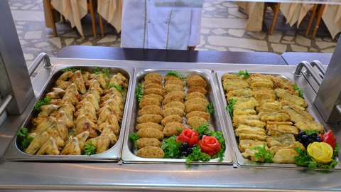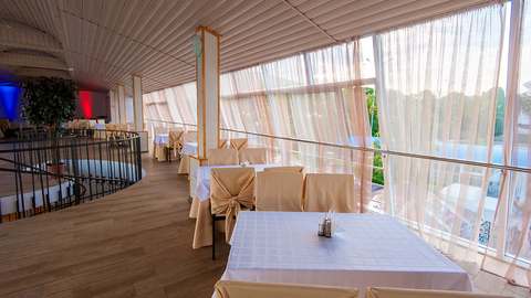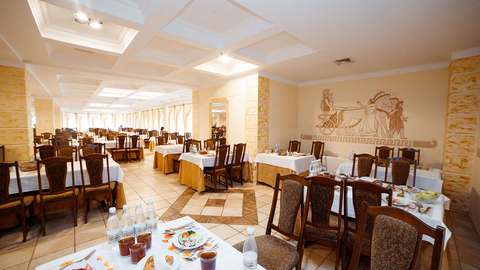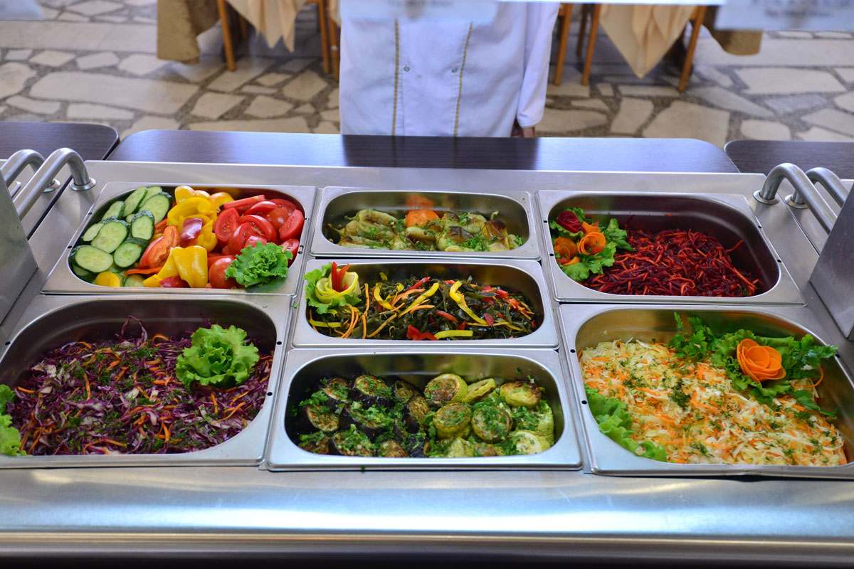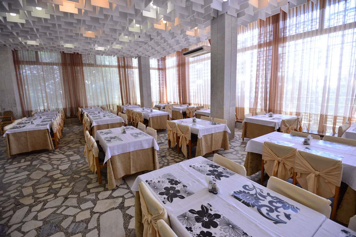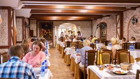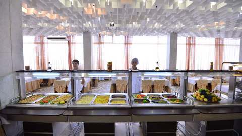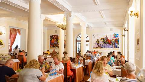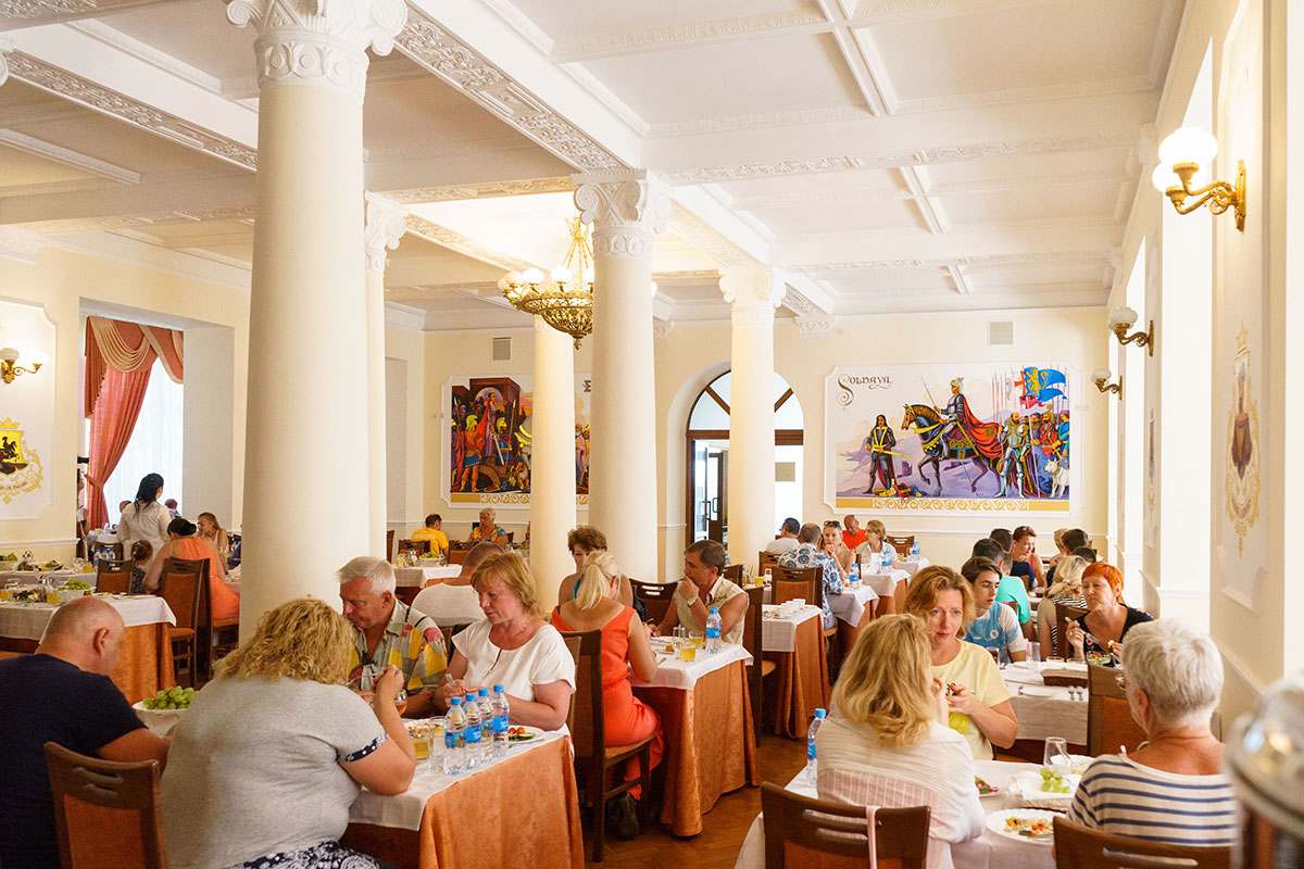 3-разовое. За гостями, проживающими в каждом корпусе закреплен определенный ресторан: корпус № 2 (все номера), 1-комнатные 2-местные номера корпусов 4, 6, 11, 5, административный корпус — кафе «Зимнее» (в сезон — заказное питание с элементами «шведского стола»); 1-местные номера корпусов 4, 11 и административного корпусов, 1-комнатные номера корпуса № 1, 2-комнатные номера корпусов 4, 5, 6, 9 ресторан «Шелковый путь» (в сезон — «шведский стол»); корпуса № 1 (двух- и 3-комнатные номера), 3, 7, 8, 10, Бизнес-центр и 3-комнатные номера корпуса № 9 — ресторан «Консул» (в сезон — заказное меню с элементами «шведского стола»).