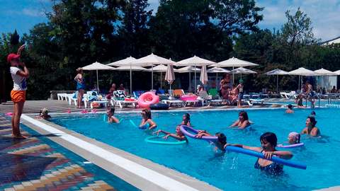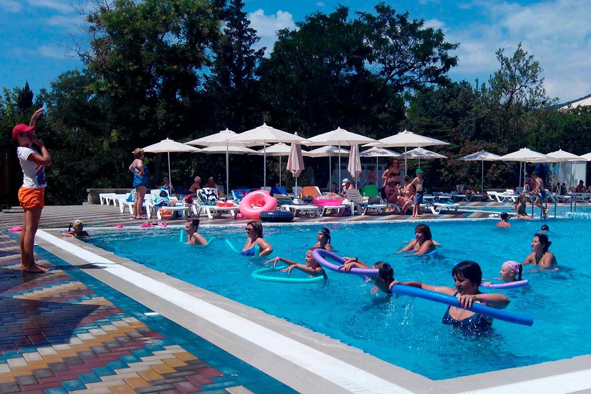 Летний открытый бассейн с морской водой в парке рядом с клубом и корпусом № 2. Длина бассейна — 40 метров, максимальная ширина — 12 метров. Бассейн разделен на три зоны: взрослую (глубиной 170 см), зону для аквааэробики (глубиной 120 см) и детскую (глубиной 80 см). На территории вокруг бассейна есть всё необходимое для отдыха: пляжная мебель (теневые зонты, шезлонги, столики), кафе с напитками и мороженым, бесплатный Wi-Fi, раздевалка, душевые кабинки, санузел, зона для курения. Детям для плавания выдаются нарукавники или спасательные жилеты. Бассейн оборудован современной круглосуточной системой очистки и фильтрации морской воды.