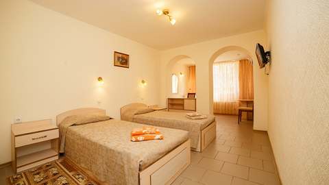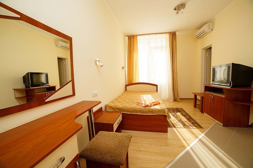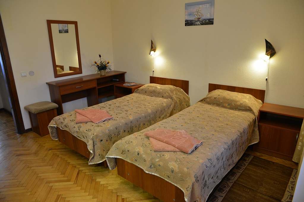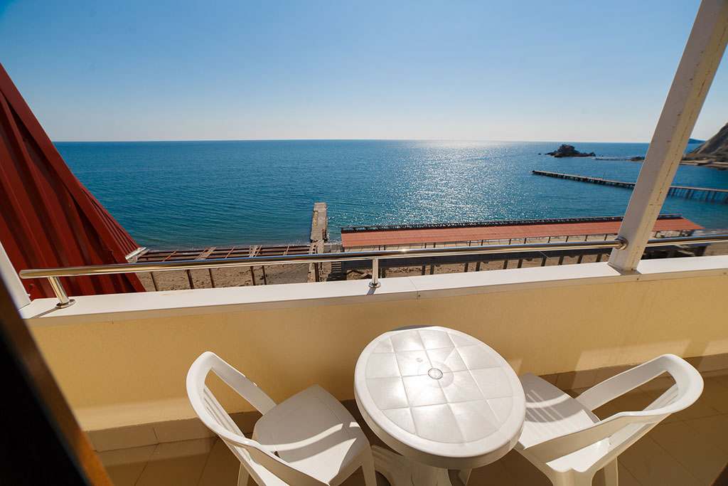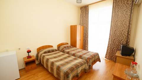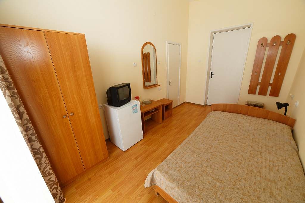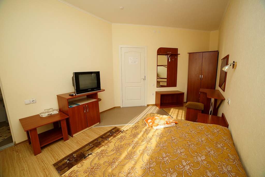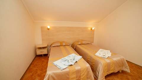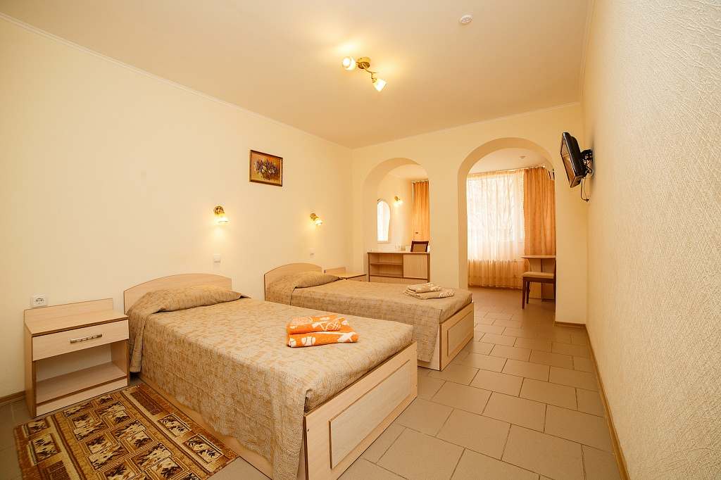 Номера с удобствами (совмещенный санузел с ванной). В номере: 2 раздельные кровати, телевизор, холодильник, кондиционер, набор мебели. Дополнительное место: еврораскладушка. Вид на море.